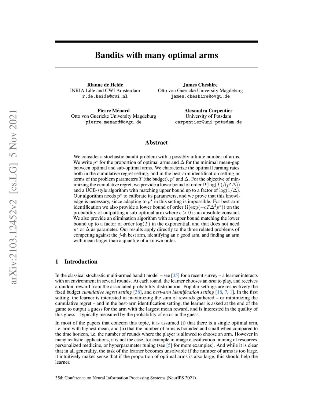 Bandits with many optimal arms