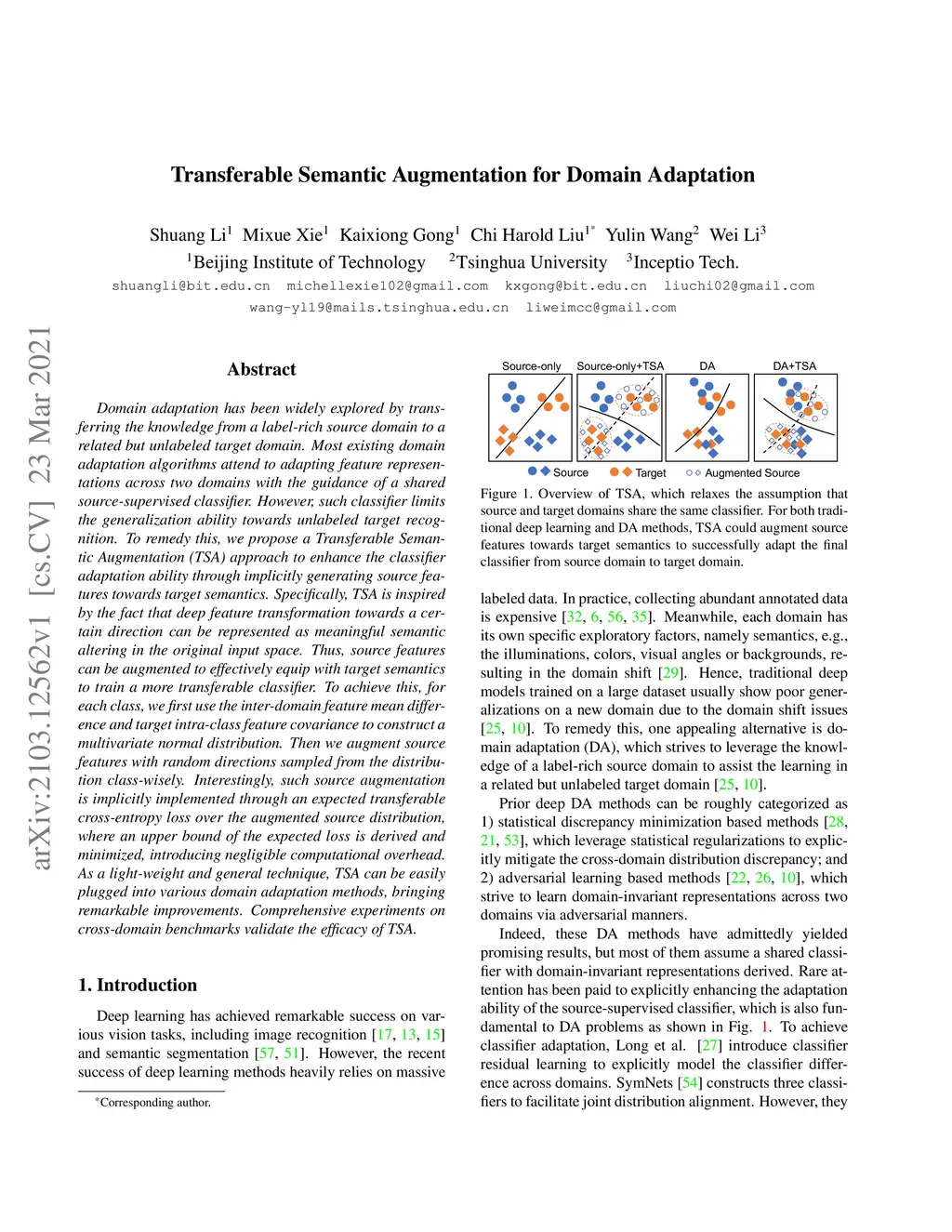 Domain adaptation has been widely explored by transferring the knowledge from a label-rich source domain to a related but unlabeled target domain. Most existing domain adaptation algorithms attend to adapting feature representations across two domains with the guidance of a shared source-supervised classifier. However, such classifier limits the generalization ability towards unlabeled target recognition. To remedy this, we propose a Transferable Semantic Augmentation (TSA) approach to enhance the classifier adaptation ability through implicitly generating source features towards target semantics. Specifically, TSA is inspired by the fact that deep feature transformation towards a certain direction can be represented as meaningful semantic altering in the original input space. Thus, source features can be augmented to effectively equip with target semantics to train a more transferable classifier. To achieve this, for each class, we first use the inter-domain feature mean difference and target intra-class feature covariance to construct a multivariate normal distribution. Then we augment source features with random directions sampled from the distribution class-wisely. Interestingly, such source augmentation is implicitly implemented through an expected transferable cross-entropy loss over the augmented source distribution, where an upper bound of the expected loss is derived and minimized, introducing negligible computational overhead. As a light-weight and general technique, TSA can be easily plugged into various domain adaptation methods, bringing remarkable improvements. Comprehensive experiments on cross-domain benchmarks validate the efficacy of TSA.