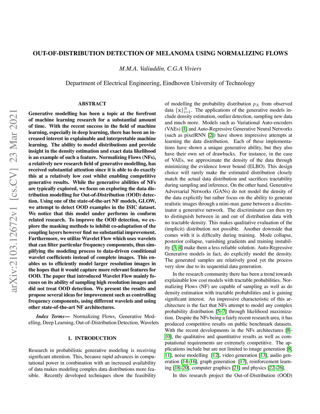 Generative modelling has been a topic at the forefront of machine learning research for a substantial amount of time. With the recent success in the field of machine learning, especially in deep learning, there has been an increased interest in explainable and interpretable machine learning. The ability to model distributions and provide insight in the density estimation and exact data likelihood is an example of such a feature. Normalizing Flows (NFs), a relatively new research field of generative modelling, has received substantial attention since it is able to do exactly this at a relatively low cost whilst enabling competitive generative results. While the generative abilities of NFs are typically explored, we focus on exploring the data distribution modelling for Out-of-Distribution (OOD) detection. Using one of the state-of-the-art NF models, GLOW, we attempt to detect OOD examples in the ISIC dataset. We notice that this model under performs in conform related research. To improve the OOD detection, we explore the masking methods to inhibit co-adaptation of the coupling layers however find no substantial improvement. Furthermore, we utilize Wavelet Flow which uses wavelets that can filter particular frequency components, thus simplifying the modeling process to data-driven conditional wavelet coefficients instead of complete images. This enables us to efficiently model larger resolution images in the hopes that it would capture more relevant features for OOD. The paper that introduced Wavelet Flow mainly focuses on its ability of sampling high resolution images and did not treat OOD detection. We present the results and propose several ideas for improvement such as controlling frequency components, using different wavelets and using other state-of-the-art NF architectures.