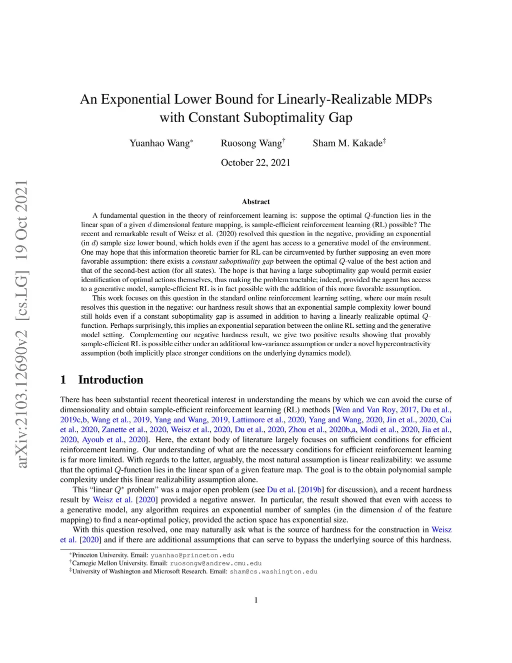 A fundamental question in the theory of reinforcement learning is: suppose the optimal -function lies in the linear span of a given dimensional feature mapping, is sample-efficient reinforcement learning (RL) possible? The recent and remarkable result of Weisz et al. (2020) resolved this question in the negative, providing an exponential (in ) sample size lower bound, which holds even if the agent has access to a generative model of the environment. One may hope that this information theoretic barrier for RL can be circumvented by further supposing an even more favorable assumption: there exists a \emph{constant suboptimality gap} between the optimal -value of the best action and that of the second-best action (for all states). The hope is that having a large suboptimality gap would permit easier identification of optimal actions themselves, thus making the problem tractable; indeed, provided the agent has access to a generative model, sample-efficient RL is in fact possible with the addition of this more favorable assumption. This work focuses on this question in the standard online reinforcement learning setting, where our main result resolves this question in the negative: our hardness result shows that an exponential sample complexity lower bound still holds even if a constant suboptimality gap is assumed in addition to having a linearly realizable optimal -function. Perhaps surprisingly, this implies an exponential separation between the online RL setting and the generative model setting. Complementing our negative hardness result, we give two positive results showing that provably sample-efficient RL is possible either under an additional low-variance assumption or under a novel hypercontractivity assumption (both implicitly place stronger conditions on the underlying dynamics model).