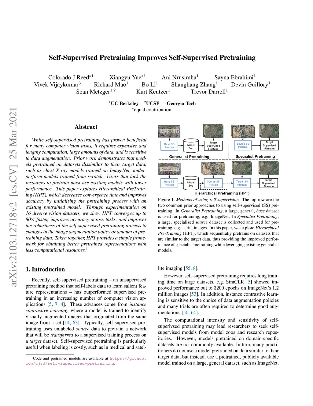 While self-supervised pretraining has proven beneficial for many computer vision tasks, it requires expensive and lengthy computation, large amounts of data, and is sensitive to data augmentation. Prior work demonstrates that models pretrained on datasets dissimilar to their target data, such as chest X-ray models trained on ImageNet, underperform models trained from scratch. Users that lack the resources to pretrain must use existing models with lower performance. This paper explores Hierarchical PreTraining (HPT), which decreases convergence time and improves accuracy by initializing the pretraining process with an existing pretrained model. Through experimentation on 16 diverse vision datasets, we show HPT converges up to 80x faster, improves accuracy across tasks, and improves the robustness of the self-supervised pretraining process to changes in the image augmentation policy or amount of pretraining data. Taken together, HPT provides a simple framework for obtaining better pretrained representations with less computational resources.