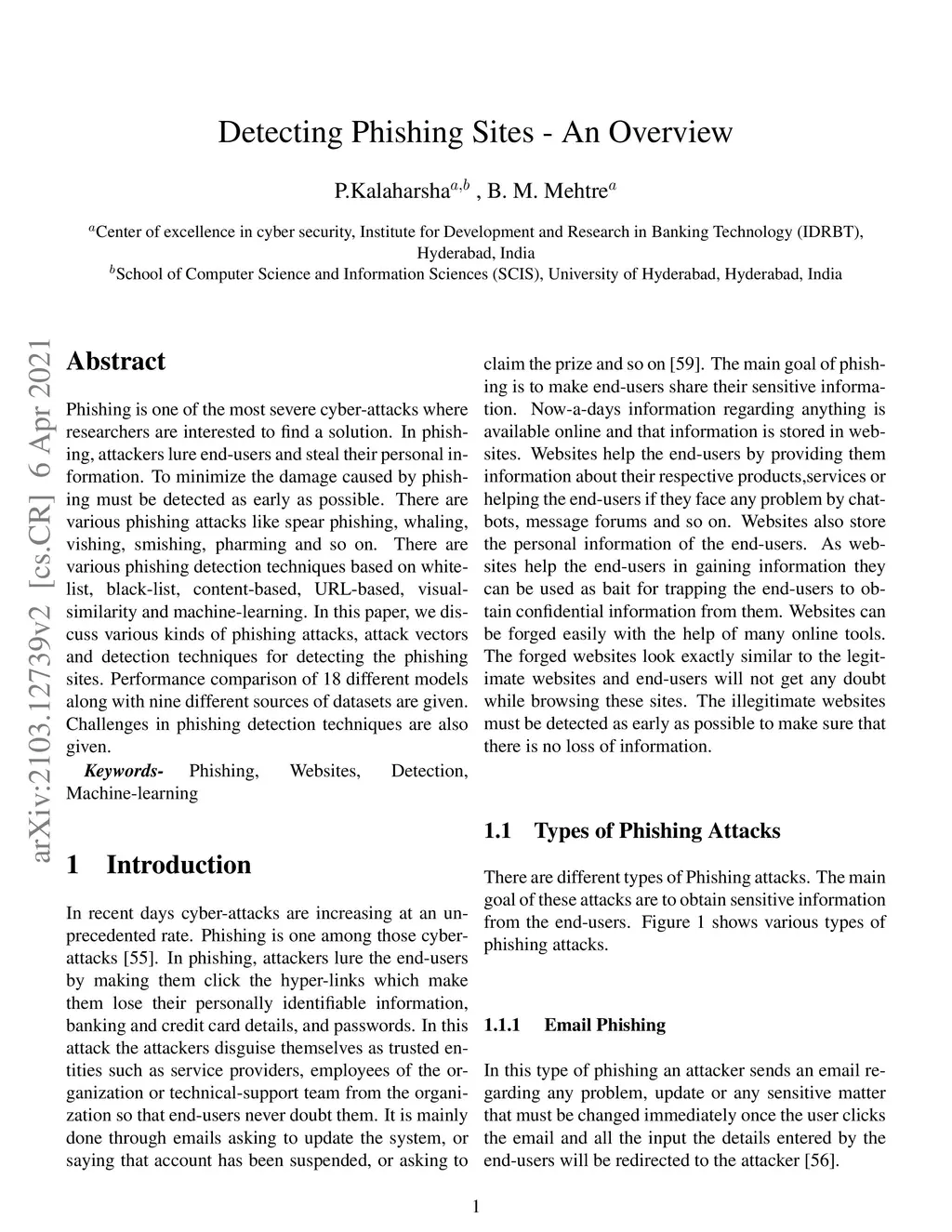 Phishing is one of the most severe cyber-attacks where researchers are interested to find a solution. In phishing, attackers lure end-users and steal their personal in-formation. To minimize the damage caused by phishing must be detected as early as possible. There are various phishing attacks like spear phishing, whaling, vishing, smishing, pharming and so on. There are various phishing detection techniques based on white-list, black-list, content-based, URL-based, visual-similarity and machine-learning. In this paper, we discuss various kinds of phishing attacks, attack vectors and detection techniques for detecting the phishing sites. Performance comparison of 18 different models along with nine different sources of datasets are given. Challenges in phishing detection techniques are also given.