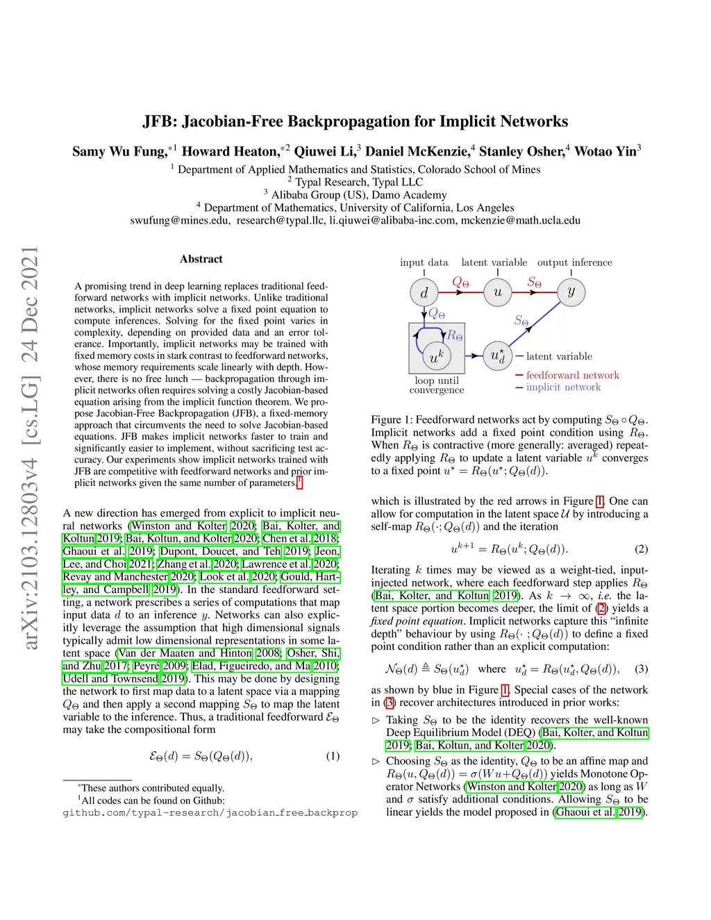 A growing trend in deep learning replaces fixed depth models by approximations of the limit as network depth approaches infinity. This approach uses a portion of network weights to prescribe behavior by defining a limit condition. This makes network depth implicit, varying based on the provided data and an error tolerance. Moreover, existing implicit models can be implemented and trained with fixed memory costs in exchange for additional computational costs. In particular, backpropagation through implicit depth models requires solving a Jacobian-based equation arising from the implicit function theorem. We propose fixed point networks (FPNs), a simple setup for implicit depth learning that guarantees convergence of forward propagation to a unique limit defined by network weights and input data. Our key contribution is to provide a new Jacobian-free backpropagation (JFB) scheme that circumvents the need to solve Jacobian-based equations while maintaining fixed memory costs. This makes FPNs much cheaper to train and easy to implement. Our numerical examples yield state of the art classification results for implicit depth models and outperform corresponding explicit models.