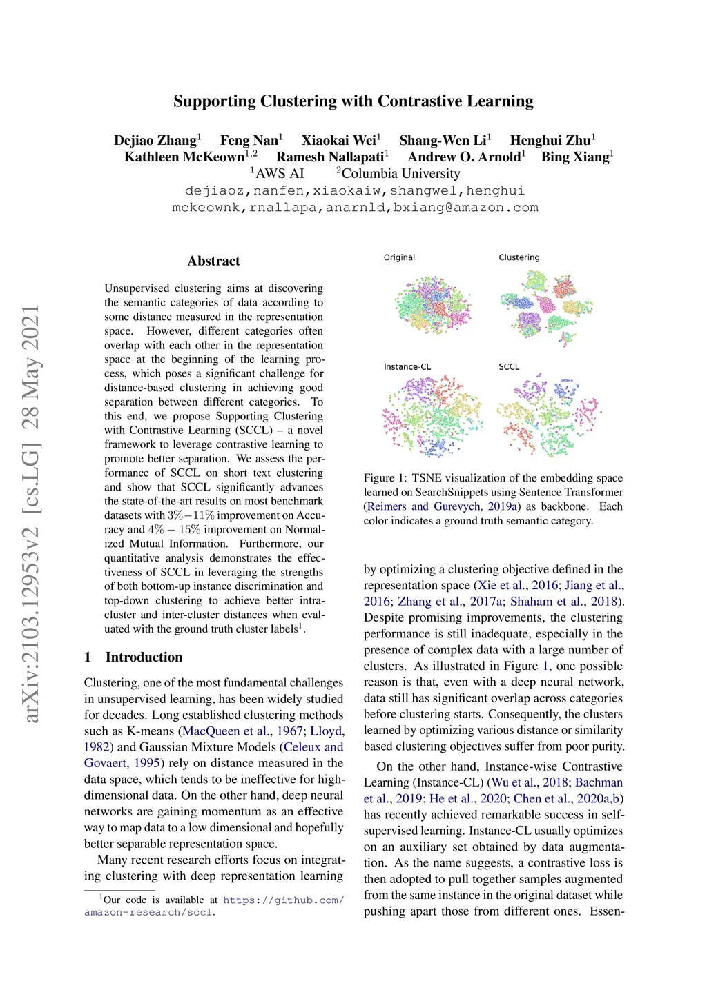 Unsupervised clustering aims at discovering the semantic categories of data according to some distance measured in the representation space. However, different categories often overlap with each other in the representation space at the beginning of the learning process, which poses a significant challenge for distance-based clustering in achieving good separation between different categories. To this end, we propose Supporting Clustering with Contrastive Learning (SCCL) -- a novel framework to leverage contrastive learning to promote better separation. We assess the performance of SCCL on short text clustering and show that SCCL significantly advances the state-of-the-art results on most benchmark datasets with 3%-11% improvement on Accuracy and 4%-15% improvement on Normalized Mutual Information. Furthermore, our quantitative analysis demonstrates the effectiveness of SCCL in leveraging the strengths of both bottom-up instance discrimination and top-down clustering to achieve better intra-cluster and inter-cluster distances when evaluated with the ground truth cluster labels.