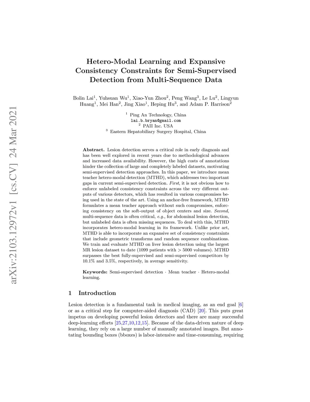 Lesion detection serves a critical role in early diagnosis and has been well explored in recent years due to methodological advancesand increased data availability. However, the high costs of annotations hinder the collection of large and completely labeled datasets, motivating semi-supervised detection approaches. In this paper, we introduce mean teacher hetero-modal detection (MTHD), which addresses two important gaps in current semi-supervised detection. First, it is not obvious how to enforce unlabeled consistency constraints across the very different outputs of various detectors, which has resulted in various compromises being used in the state of the art. Using an anchor-free framework, MTHD formulates a mean teacher approach without such compromises, enforcing consistency on the soft-output of object centers and size. Second, multi-sequence data is often critical, e.g., for abdominal lesion detection, but unlabeled data is often missing sequences. To deal with this, MTHD incorporates hetero-modal learning in its framework. Unlike prior art, MTHD is able to incorporate an expansive set of consistency constraints that include geometric transforms and random sequence combinations. We train and evaluate MTHD on liver lesion detection using the largest MR lesion dataset to date (1099 patients with >5000 volumes). MTHD surpasses the best fully-supervised and semi-supervised competitors by 10.1% and 3.5%, respectively, in average sensitivity.
