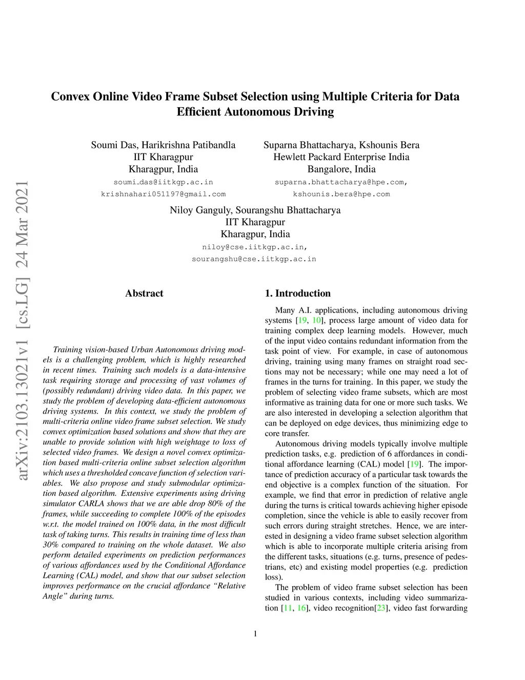 Training vision-based Urban Autonomous driving models is a challenging problem, which is highly researched in recent times. Training such models is a data-intensive task requiring the storage and processing of vast volumes of (possibly redundant) driving video data. In this paper, we study the problem of developing data-efficient autonomous driving systems. In this context, we study the problem of multi-criteria online video frame subset selection. We study convex optimization-based solutions and show that they are unable to provide solutions with high weightage to the loss of selected video frames. We design a novel convex optimization-based multi-criteria online subset selection algorithm that uses a thresholded concave function of selection variables. We also propose and study a submodular optimization-based algorithm. Extensive experiments using the driving simulator CARLA show that we are able to drop 80% of the frames while succeeding to complete 100% of the episodes w.r.t. the model trained on 100% data, in the most difficult task of taking turns. This results in a training time of less than 30% compared to training on the whole dataset. We also perform detailed experiments on prediction performances of various affordances used by the Conditional Affordance Learning (CAL) model and show that our subset selection improves performance on the crucial affordance "Relative Angle" during turns.
