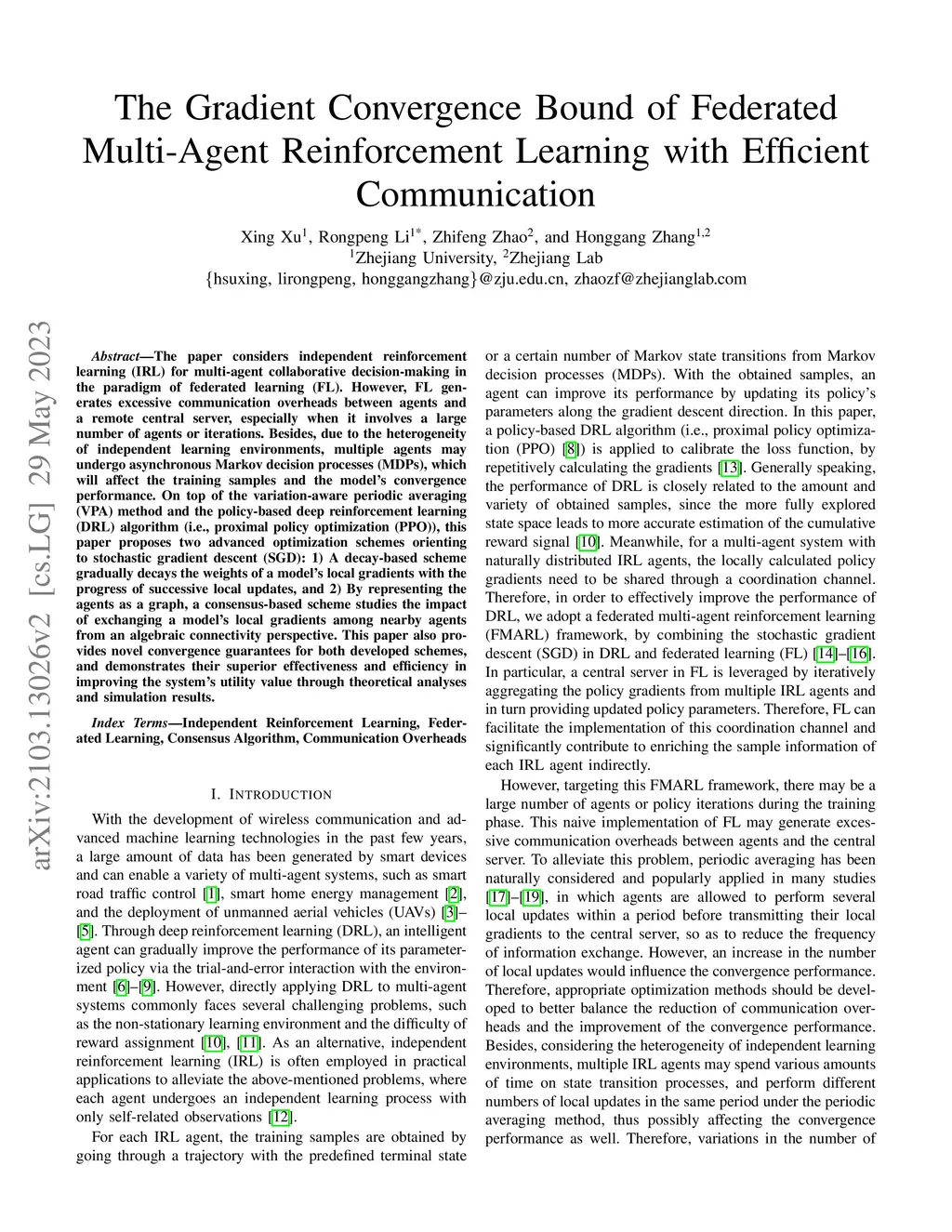 The paper considers independent reinforcement learning (IRL) for multi-agent collaborative decision-making in the paradigm of federated learning (FL). However, FL generates excessive communication overheads between agents and a remote central server, especially when it involves a large number of agents or iterations. Besides, due to the heterogeneity of independent learning environments, multiple agents may undergo asynchronous Markov decision processes (MDPs), which will affect the training samples and the model's convergence performance. On top of the variation-aware periodic averaging (VPA) method and the policy-based deep reinforcement learning (DRL) algorithm (i.e., proximal policy optimization (PPO)), this paper proposes two advanced optimization schemes orienting to stochastic gradient descent (SGD): 1) A decay-based scheme gradually decays the weights of a model's local gradients with the progress of successive local updates, and 2) By representing the agents as a graph, a consensus-based scheme studies the impact of exchanging a model's local gradients among nearby agents from an algebraic connectivity perspective. This paper also provides novel convergence guarantees for both developed schemes, and demonstrates their superior effectiveness and efficiency in improving the system's utility value through theoretical analyses and simulation results.