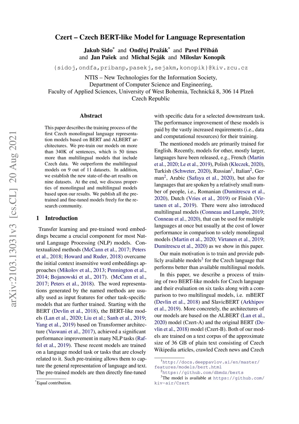 This paper describes the training process of the first Czech monolingual language representation models based on BERT and ALBERT architectures. We pre-train our models on more than 340K of sentences, which is 50 times more than multilingual models that include Czech data. We outperform the multilingual models on 9 out of 11 datasets. In addition, we establish the new state-of-the-art results on nine datasets. At the end, we discuss properties of monolingual and multilingual models based upon our results. We publish all the pre-trained and fine-tuned models freely for the research community.