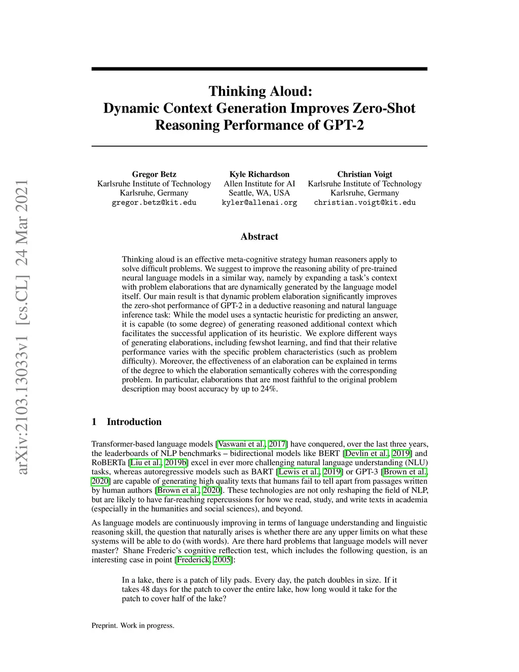 Thinking aloud is an effective meta-cognitive strategy human reasoners apply to solve difficult problems. We suggest to improve the reasoning ability of pre-trained neural language models in a similar way, namely by expanding a task's context with problem elaborations that are dynamically generated by the language model itself. Our main result is that dynamic problem elaboration significantly improves the zero-shot performance of GPT-2 in a deductive reasoning and natural language inference task: While the model uses a syntactic heuristic for predicting an answer, it is capable (to some degree) of generating reasoned additional context which facilitates the successful application of its heuristic. We explore different ways of generating elaborations, including fewshot learning, and find that their relative performance varies with the specific problem characteristics (such as problem difficulty). Moreover, the effectiveness of an elaboration can be explained in terms of the degree to which the elaboration semantically coheres with the corresponding problem. In particular, elaborations that are most faithful to the original problem description may boost accuracy by up to 24%.