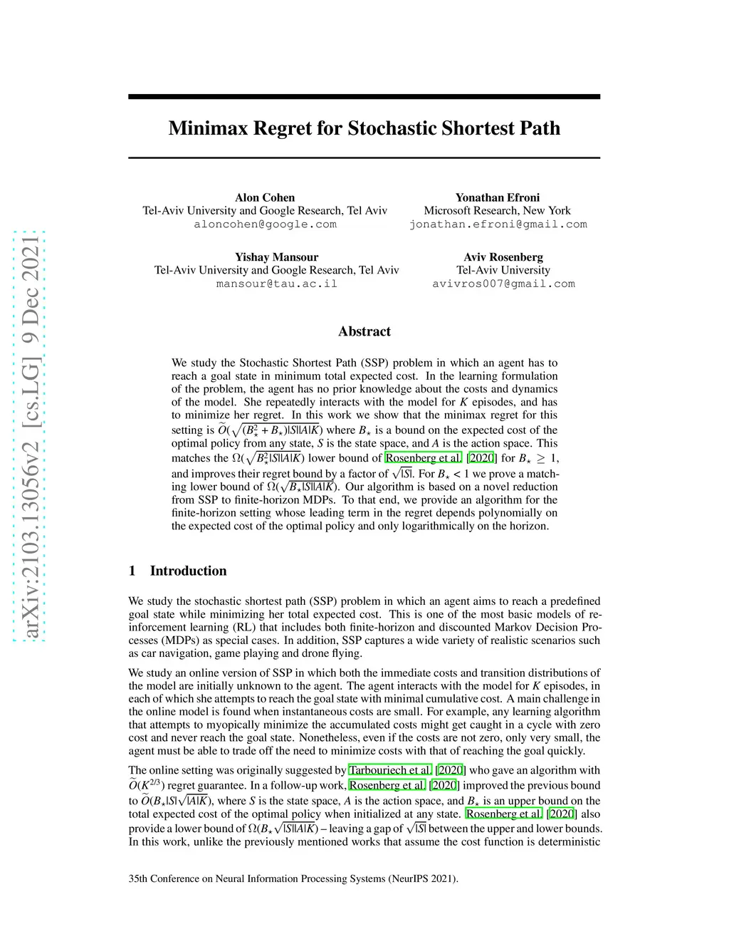 We study the Stochastic Shortest Path (SSP) problem in which an agent has to reach a goal state in minimum total expected cost. In the learning formulation of the problem, the agent has no prior knowledge about the costs and dynamics of the model. She repeatedly interacts with the model for episodes, and has to minimize her regret. In this work we show that the minimax regret for this setting is where is a bound on the expected cost of the optimal policy from any state, is the state space, and is the action space. This matches the lower bound of Rosenberg et al. [2020] for , and improves their regret bound by a factor of . For we prove a matching lower bound of . Our algorithm is based on a novel reduction from SSP to finite-horizon MDPs. To that end, we provide an algorithm for the finite-horizon setting whose leading term in the regret depends polynomially on the expected cost of the optimal policy and only logarithmically on the horizon.