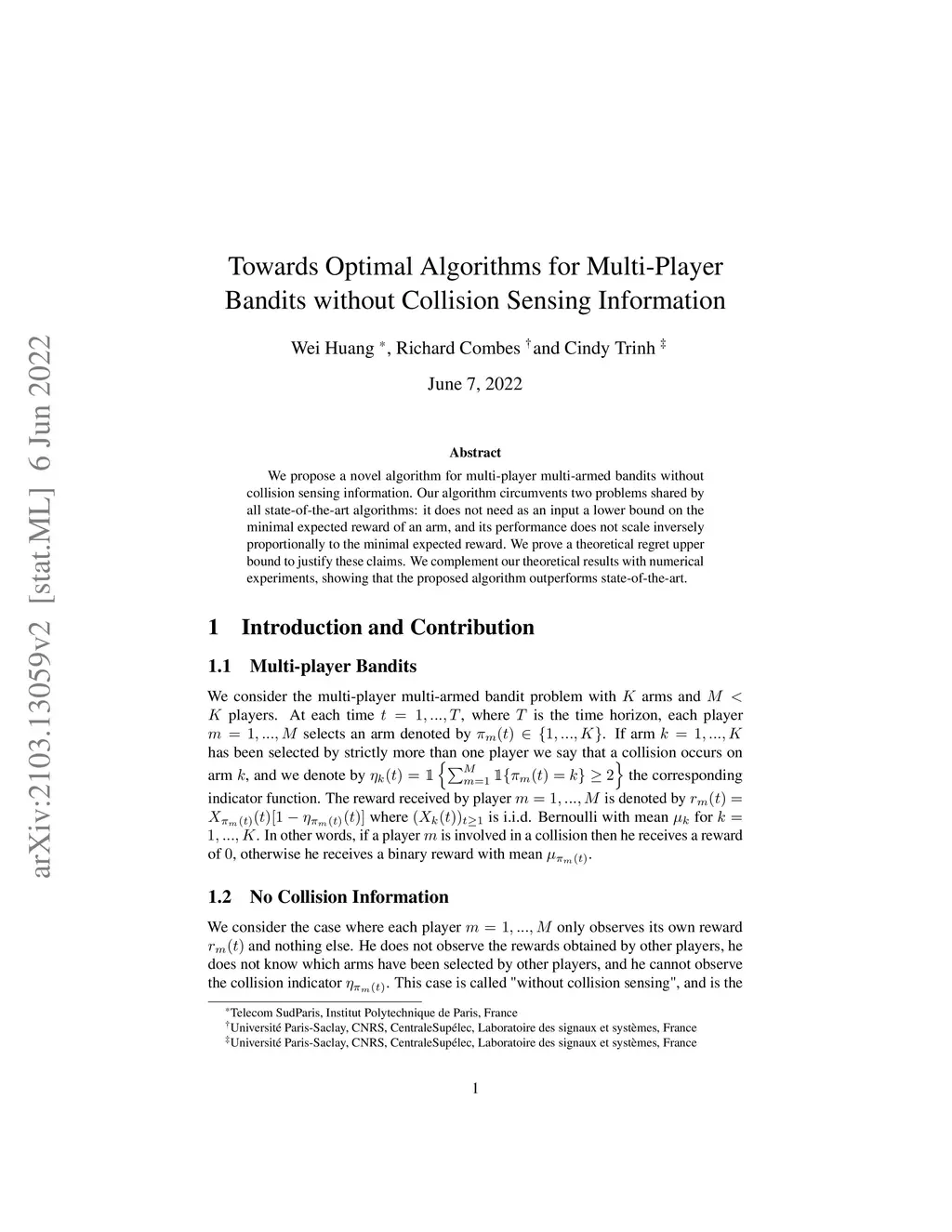 Towards Optimal Algorithms for Multi-Player Bandits without Collision