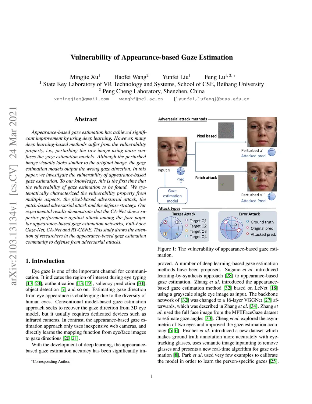 Appearance-based gaze estimation has achieved significant improvement by using deep learning. However, many deep learning-based methods suffer from the vulnerability property, i.e., perturbing the raw image using noise confuses the gaze estimation models. Although the perturbed image visually looks similar to the original image, the gaze estimation models output the wrong gaze direction. In this paper, we investigate the vulnerability of appearance-based gaze estimation. To our knowledge, this is the first time that the vulnerability of gaze estimation to be found. We systematically characterized the vulnerability property from multiple aspects, the pixel-based adversarial attack, the patch-based adversarial attack and the defense strategy. Our experimental results demonstrate that the CA-Net shows superior performance against attack among the four popular appearance-based gaze estimation networks, Full-Face, Gaze-Net, CA-Net and RT-GENE. This study draws the attention of researchers in the appearance-based gaze estimation community to defense from adversarial attacks.