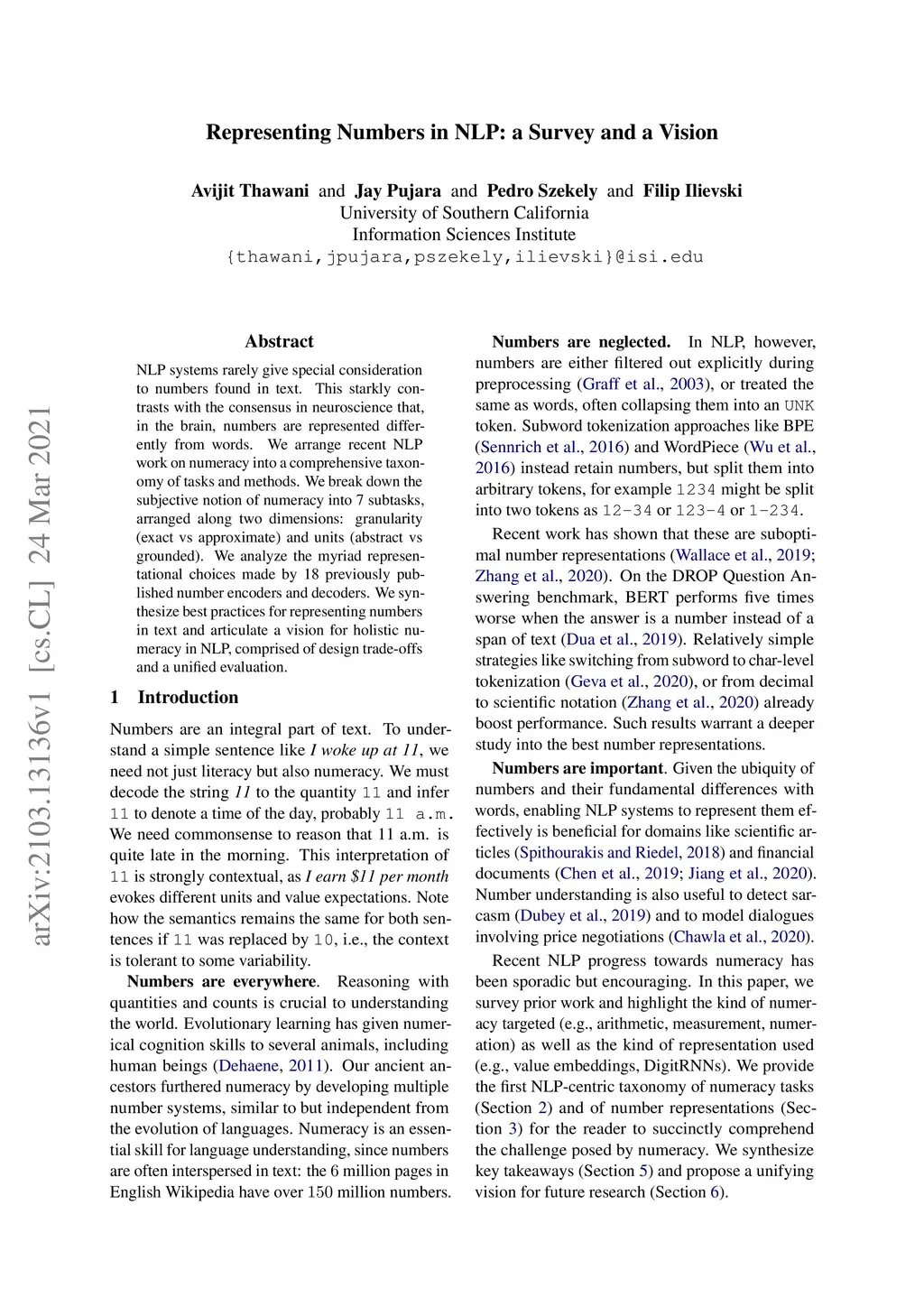 NLP systems rarely give special consideration to numbers found in text. This starkly contrasts with the consensus in neuroscience that, in the brain, numbers are represented differently from words. We arrange recent NLP work on numeracy into a comprehensive taxonomy of tasks and methods. We break down the subjective notion of numeracy into 7 subtasks, arranged along two dimensions: granularity (exact vs approximate) and units (abstract vs grounded). We analyze the myriad representational choices made by 18 previously published number encoders and decoders. We synthesize best practices for representing numbers in text and articulate a vision for holistic numeracy in NLP, comprised of design trade-offs and a unified evaluation.