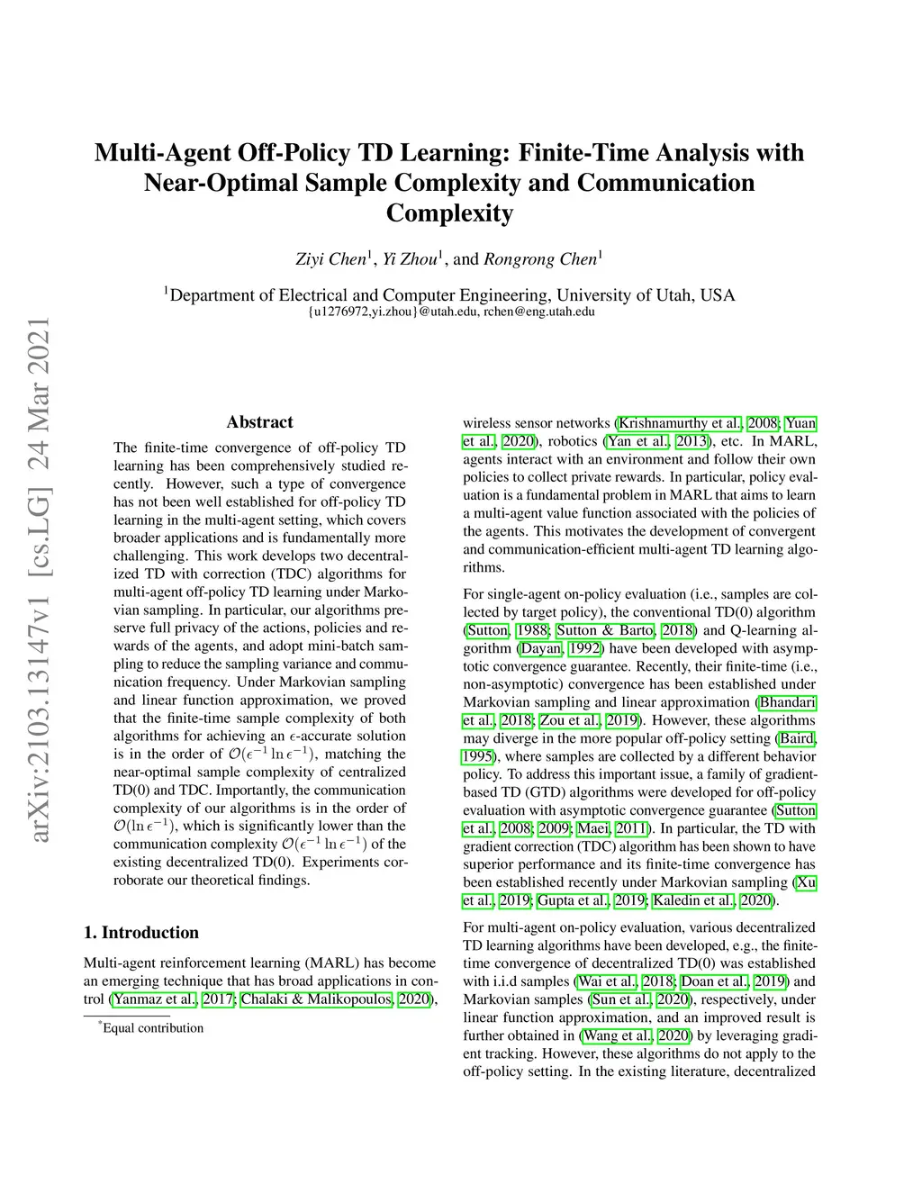 The finite-time convergence of off-policy TD learning has been comprehensively studied recently. However, such a type of convergence has not been well established for off-policy TD learning in the multi-agent setting, which covers broader applications and is fundamentally more challenging. This work develops two decentralized TD with correction (TDC) algorithms for multi-agent off-policy TD learning under Markovian sampling. In particular, our algorithms preserve full privacy of the actions, policies and rewards of the agents, and adopt mini-batch sampling to reduce the sampling variance and communication frequency. Under Markovian sampling and linear function approximation, we proved that the finite-time sample complexity of both algorithms for achieving an -accurate solution is in the order of , matching the near-optimal sample complexity of centralized TD(0) and TDC. Importantly, the communication complexity of our algorithms is in the order of , which is significantly lower than the communication complexity of the existing decentralized TD(0). Experiments corroborate our theoretical findings.