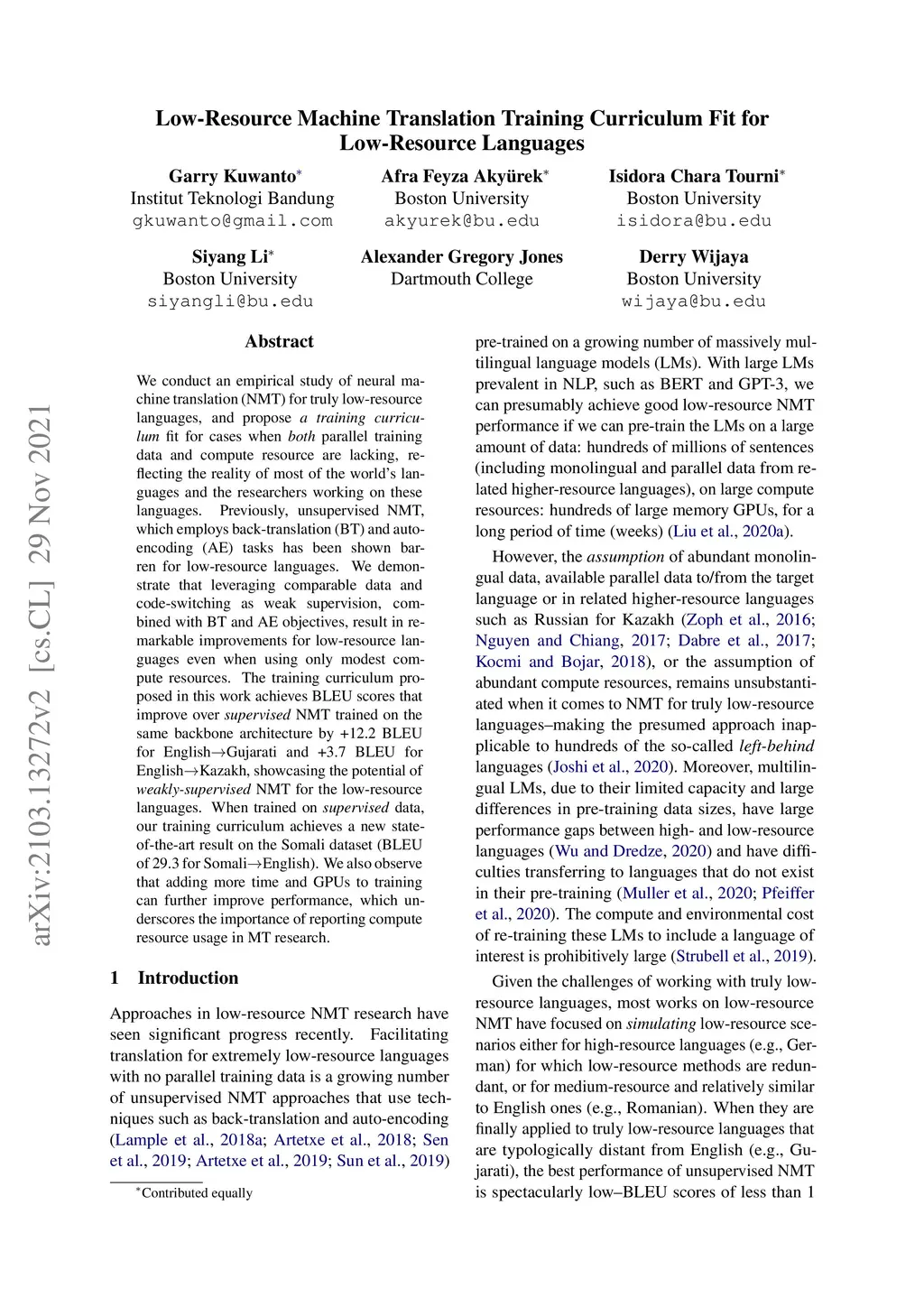 We conduct an empirical study of neural machine translation (NMT) for truly low-resource languages, and propose a training curriculum fit for cases when both parallel training data and compute resource are lacking, reflecting the reality of most of the world's languages and the researchers working on these languages. Previously, unsupervised NMT, which employs back-translation (BT) and auto-encoding (AE) tasks has been shown barren for low-resource languages. We demonstrate that leveraging comparable data and code-switching as weak supervision, combined with BT and AE objectives, result in remarkable improvements for low-resource languages even when using only modest compute resources. The training curriculum proposed in this work achieves BLEU scores that improve over supervised NMT trained on the same backbone architecture by +12.2 BLEU for English to Gujarati and +3.7 BLEU for English to Kazakh, showcasing the potential of weakly-supervised NMT for the low-resource languages. When trained on supervised data, our training curriculum achieves a new state-of-the-art result on the Somali dataset (BLEU of 29.3 for Somali to English). We also observe that adding more time and GPUs to training can further improve performance, which underscores the importance of reporting compute resource usage in MT research.