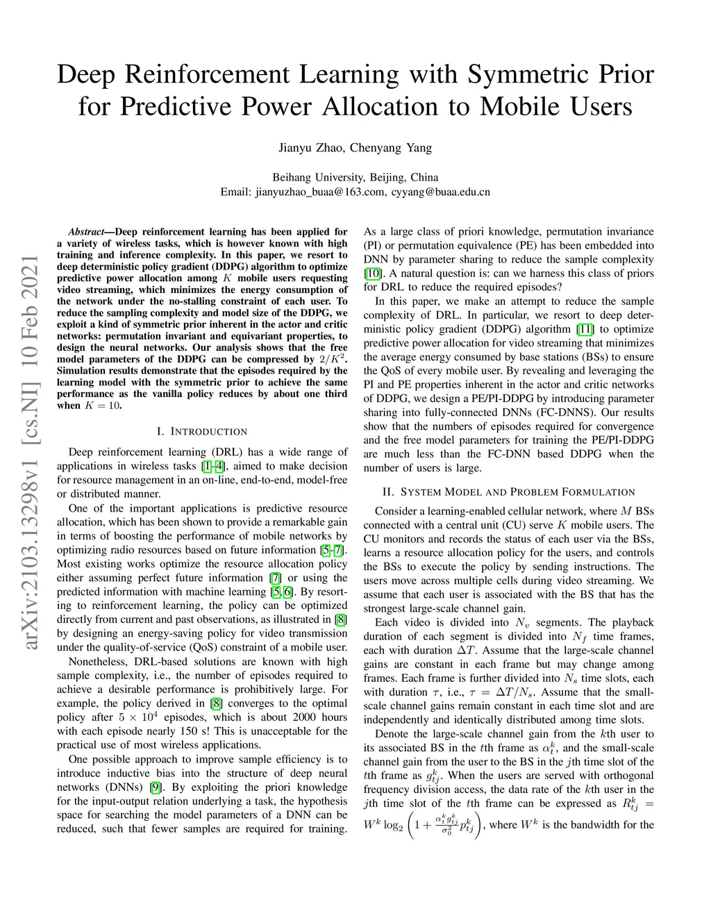 Deep reinforcement learning has been applied for a variety of wireless tasks, which is however known with high training and inference complexity. In this paper, we resort to deep deterministic policy gradient (DDPG) algorithm to optimize predictive power allocation among K mobile users requesting video streaming, which minimizes the energy consumption of the network under the no-stalling constraint of each user. To reduce the sampling complexity and model size of the DDPG, we exploit a kind of symmetric prior inherent in the actor and critic networks: permutation invariant and equivariant properties, to design the neural networks. Our analysis shows that the free model parameters of the DDPG can be compressed by 2/K^2. Simulation results demonstrate that the episodes required by the learning model with the symmetric prior to achieve the same performance as the vanilla policy reduces by about one third when K = 10.