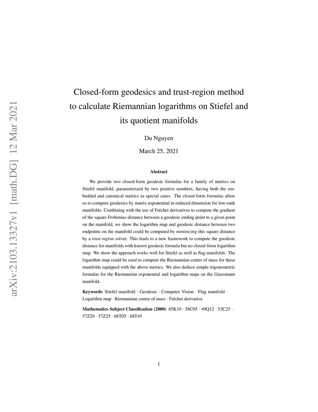 Closed-form geodesics and trust-region method to calculate Riemannian