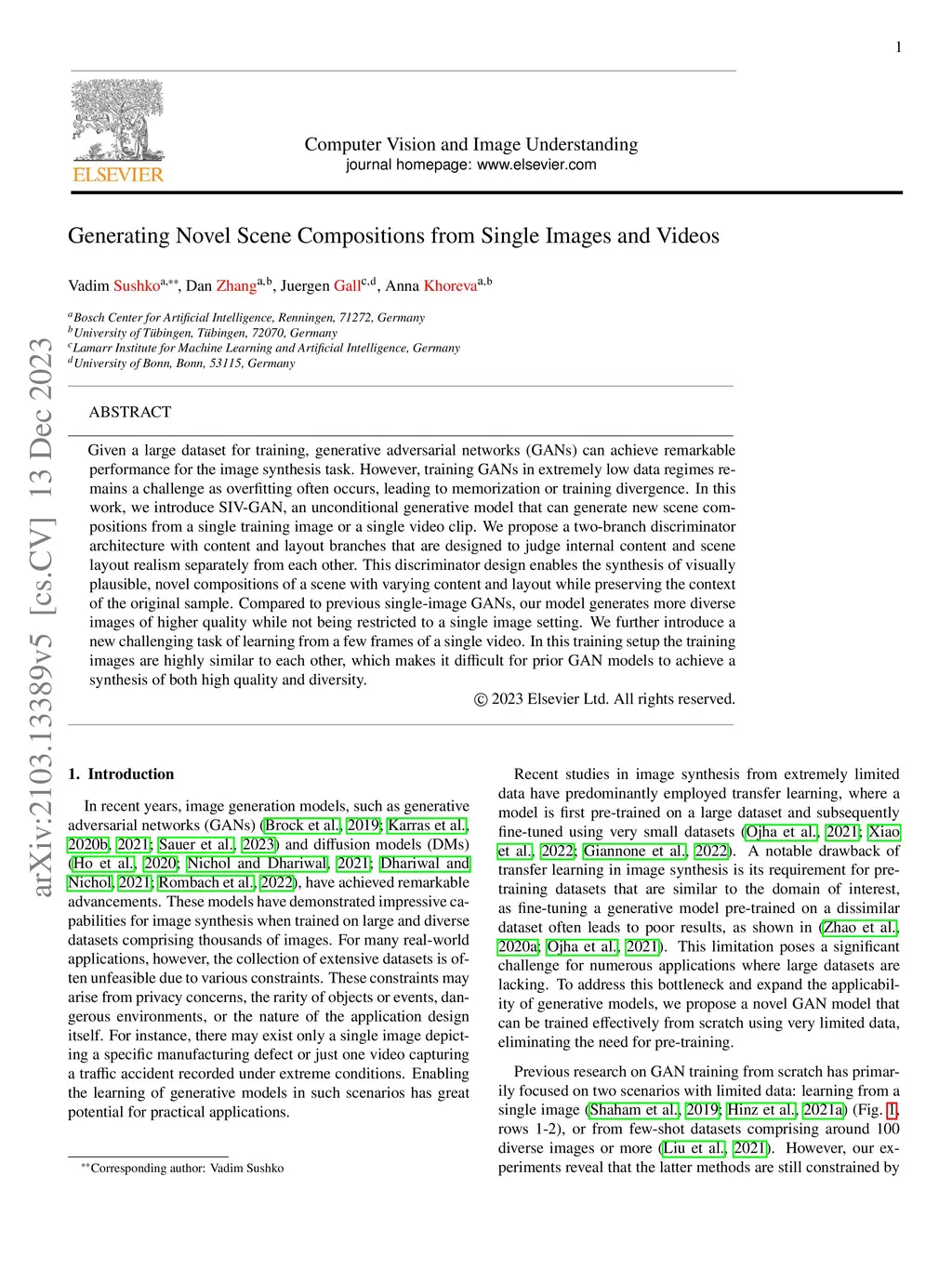 Given a large dataset for training, generative adversarial networks (GANs) can achieve remarkable performance for the image synthesis task. However, training GANs in extremely low data regimes remains a challenge, as overfitting often occurs, leading to memorization or training divergence. In this work, we introduce SIV-GAN, an unconditional generative model that can generate new scene compositions from a single training image or a single video clip. We propose a two-branch discriminator architecture, with content and layout branches designed to judge internal content and scene layout realism separately from each other. This discriminator design enables synthesis of visually plausible, novel compositions of a scene, with varying content and layout, while preserving the context of the original sample. Compared to previous single image GANs, our model generates more diverse, higher quality images, while not being restricted to a single image setting. We further introduce a new challenging task of learning from a few frames of a single video. In this training setup the training images are highly similar to each other, which makes it difficult for prior GAN models to achieve a synthesis of both high quality and diversity.