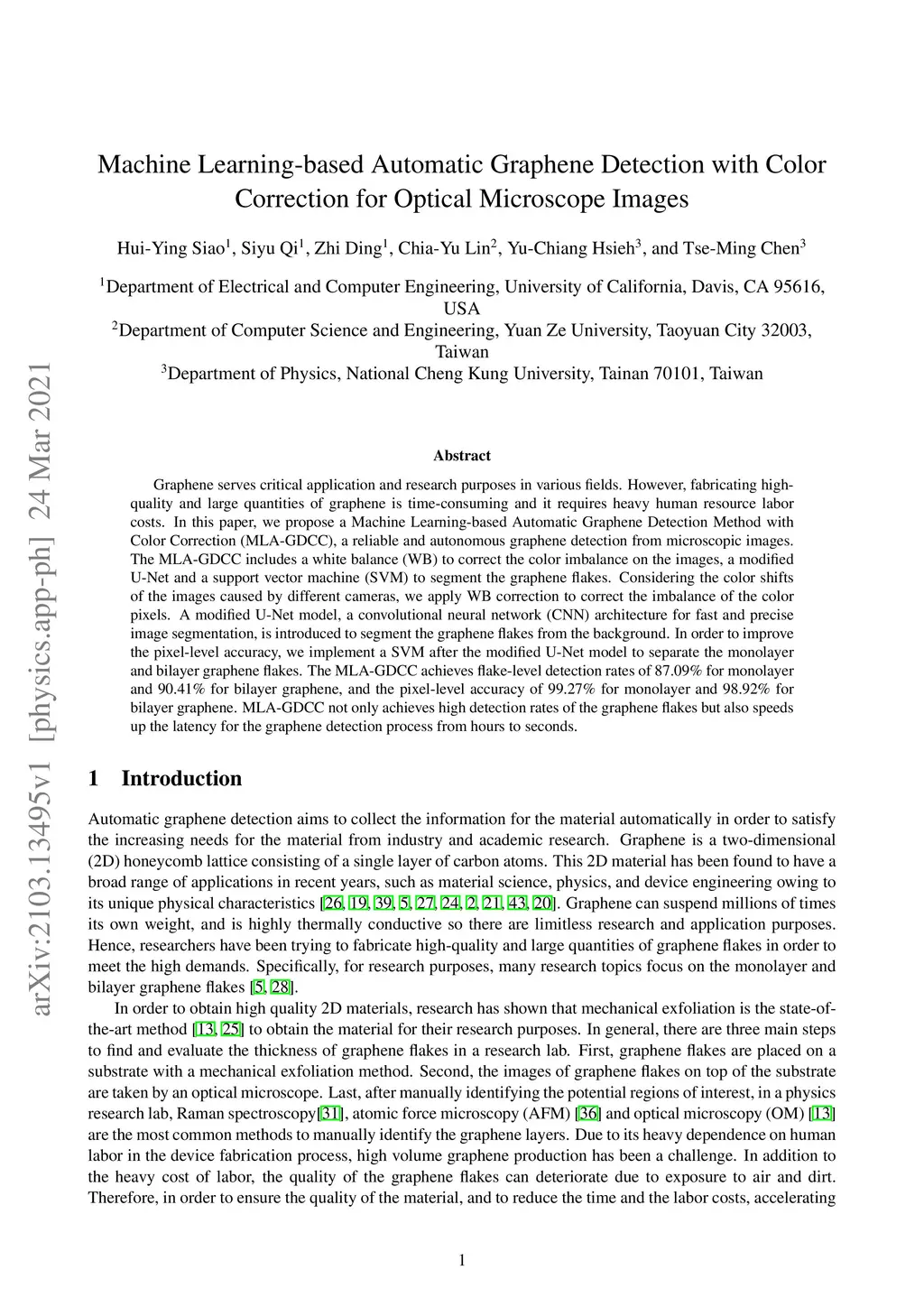 Graphene serves critical application and research purposes in various fields. However, fabricating high-quality and large quantities of graphene is time-consuming and it requires heavy human resource labor costs. In this paper, we propose a Machine Learning-based Automatic Graphene Detection Method with Color Correction (MLA-GDCC), a reliable and autonomous graphene detection from microscopic images. The MLA-GDCC includes a white balance (WB) to correct the color imbalance on the images, a modified U-Net and a support vector machine (SVM) to segment the graphene flakes. Considering the color shifts of the images caused by different cameras, we apply WB correction to correct the imbalance of the color pixels. A modified U-Net model, a convolutional neural network (CNN) architecture for fast and precise image segmentation, is introduced to segment the graphene flakes from the background. In order to improve the pixel-level accuracy, we implement a SVM after the modified U-Net model to separate the monolayer and bilayer graphene flakes. The MLA-GDCC achieves flake-level detection rates of 87.09% for monolayer and 90.41% for bilayer graphene, and the pixel-level accuracy of 99.27% for monolayer and 98.92% for bilayer graphene. MLA-GDCC not only achieves high detection rates of the graphene flakes but also speeds up the latency for the graphene detection process from hours to seconds.