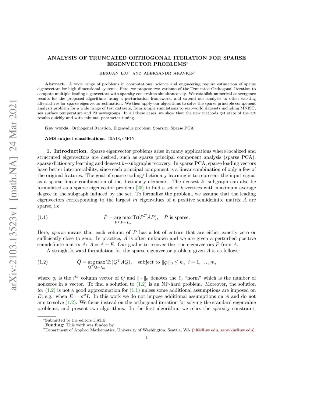 A wide range of problems in computational science and engineering require estimation of sparse eigenvectors for high dimensional systems. Here, we propose two variants of the Truncated Orthogonal Iteration to compute multiple leading eigenvectors with sparsity constraints simultaneously. We establish numerical convergence results for the proposed algorithms using a perturbation framework, and extend our analysis to other existing alternatives for sparse eigenvector estimation. We then apply our algorithms to solve the sparse principle component analysis problem for a wide range of test datasets, from simple simulations to real-world datasets including MNIST, sea surface temperature and 20 newsgroups. In all these cases, we show that the new methods get state of the art results quickly and with minimal parameter tuning.
