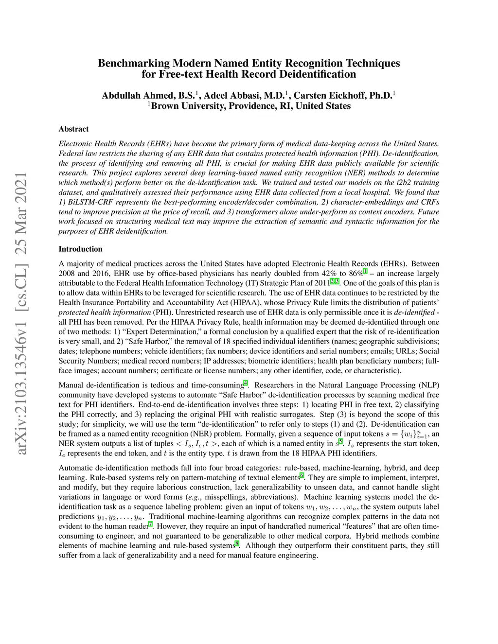 Electronic Health Records (EHRs) have become the primary form of medical data-keeping across the United States. Federal law restricts the sharing of any EHR data that contains protected health information (PHI). De-identification, the process of identifying and removing all PHI, is crucial for making EHR data publicly available for scientific research. This project explores several deep learning-based named entity recognition (NER) methods to determine which method(s) perform better on the de-identification task. We trained and tested our models on the i2b2 training dataset, and qualitatively assessed their performance using EHR data collected from a local hospital. We found that 1) BiLSTM-CRF represents the best-performing encoder/decoder combination, 2) character-embeddings and CRFs tend to improve precision at the price of recall, and 3) transformers alone under-perform as context encoders. Future work focused on structuring medical text may improve the extraction of semantic and syntactic information for the purposes of EHR de-identification.