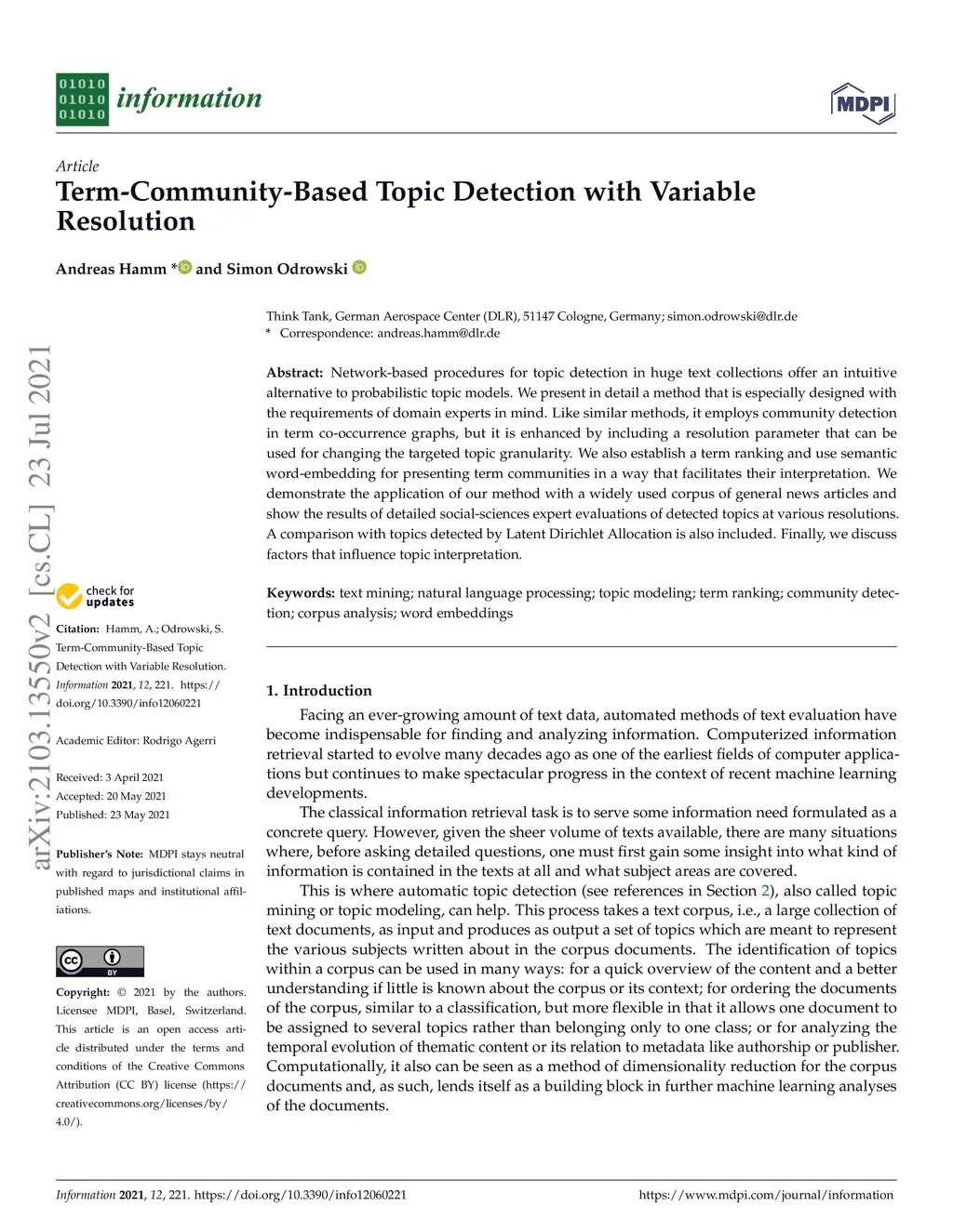 Network-based procedures for topic detection in huge text collections offer an intuitive alternative to probabilistic topic models. We present in detail a method that is especially designed with the requirements of domain experts in mind. Like similar methods, it employs community detection in term co-occurrence graphs, but it is enhanced by including a resolution parameter that can be used for changing the targeted topic granularity. We also establish a term ranking and use semantic word-embedding for presenting term communities in a way that facilitates their interpretation. We demonstrate the application of our method with a widely used corpus of general news articles and show the results of detailed social-sciences expert evaluations of detected topics at various resolutions. A comparison with topics detected by Latent Dirichlet Allocation is also included. Finally, we discuss factors that influence topic interpretation.