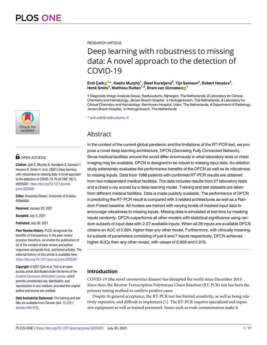 In the context of the current global pandemic and the limitations of the RT-PCR test, we propose a novel deep learning architecture, DFCN (Denoising Fully Connected Network). Since medical facilities around the world differ enormously in what laboratory tests or chest imaging may be available, DFCN is designed to be robust to missing input data. An ablation study extensively evaluates the performance benefits of the DFCN as well as its robustness to missing inputs. Data from 1088 patients with confirmed RT-PCR results are obtained from two independent medical facilities. The data includes results from 27 laboratory tests and a chest x-ray scored by a deep learning model. Training and test datasets are taken from different medical facilities. Data is made publicly available. The performance of DFCN in predicting the RT-PCR result is compared with 3 related architectures as well as a Random Forest baseline. All models are trained with varying levels of masked input data to encourage robustness to missing inputs. Missing data is simulated at test time by masking inputs randomly. DFCN outperforms all other models with statistical significance using random subsets of input data with 2-27 available inputs. When all 28 inputs are available DFCN obtains an AUC of 0.924, higher than any other model. Furthermore, with clinically meaningful subsets of parameters consisting of just 6 and 7 inputs respectively, DFCN achieves higher AUCs than any other model, with values of 0.909 and 0.919.