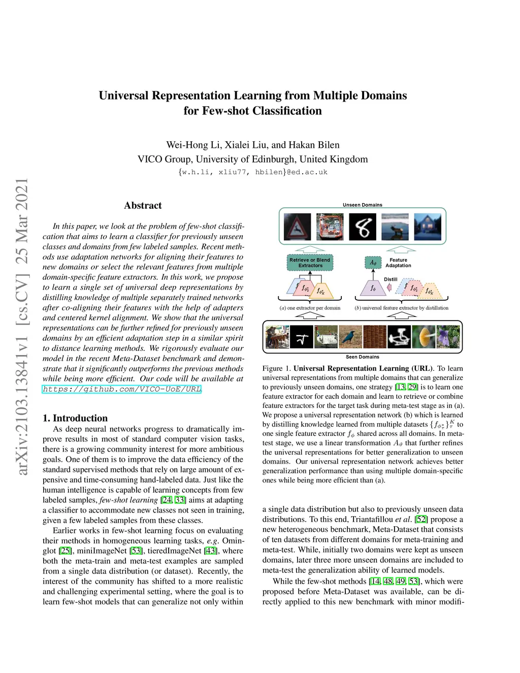 In this paper, we look at the problem of few-shot classification that aims to learn a classifier for previously unseen classes and domains from few labeled samples. Recent methods use adaptation networks for aligning their features to new domains or select the relevant features from multiple domain-specific feature extractors. In this work, we propose to learn a single set of universal deep representations by distilling knowledge of multiple separately trained networks after co-aligning their features with the help of adapters and centered kernel alignment. We show that the universal representations can be further refined for previously unseen domains by an efficient adaptation step in a similar spirit to distance learning methods. We rigorously evaluate our model in the recent Meta-Dataset benchmark and demonstrate that it significantly outperforms the previous methods while being more efficient. Our code will be available at https://github.com/VICO-UoE/URL.