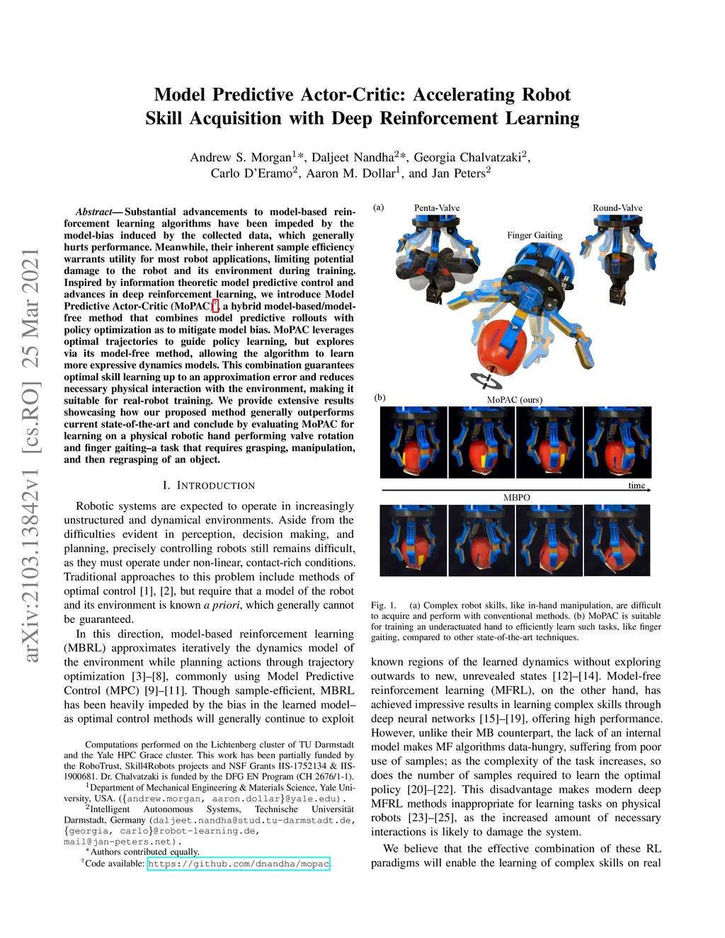 Substantial advancements to model-based reinforcement learning algorithms have been impeded by the model-bias induced by the collected data, which generally hurts performance. Meanwhile, their inherent sample efficiency warrants utility for most robot applications, limiting potential damage to the robot and its environment during training. Inspired by information theoretic model predictive control and advances in deep reinforcement learning, we introduce Model Predictive Actor-Critic (MoPAC), a hybrid model-based/model-free method that combines model predictive rollouts with policy optimization as to mitigate model bias. MoPAC leverages optimal trajectories to guide policy learning, but explores via its model-free method, allowing the algorithm to learn more expressive dynamics models. This combination guarantees optimal skill learning up to an approximation error and reduces necessary physical interaction with the environment, making it suitable for real-robot training. We provide extensive results showcasing how our proposed method generally outperforms current state-of-the-art and conclude by evaluating MoPAC for learning on a physical robotic hand performing valve rotation and finger gaiting--a task that requires grasping, manipulation, and then regrasping of an object.