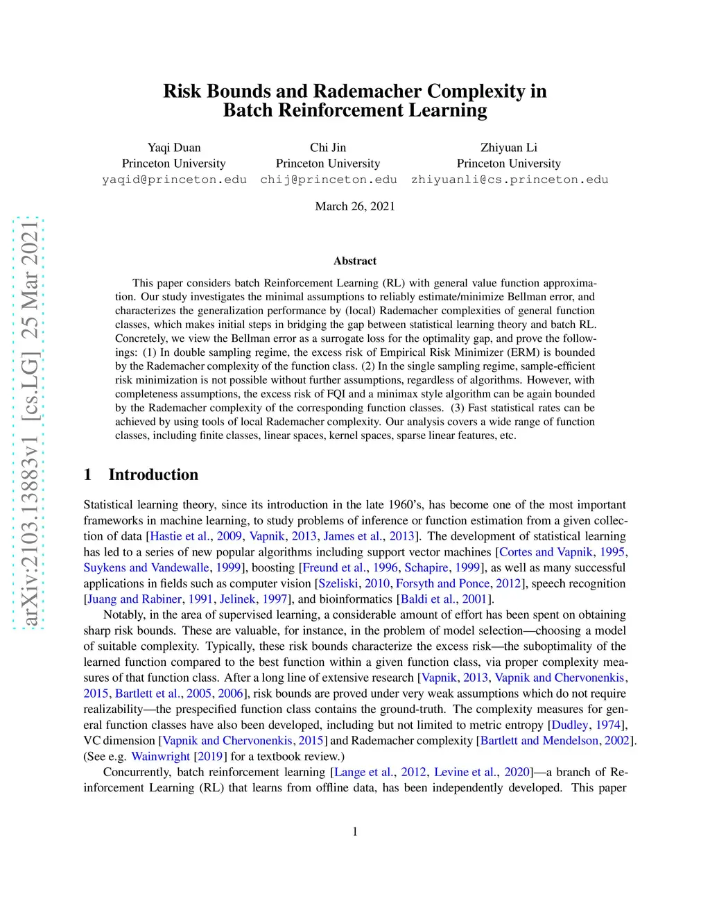 This paper considers batch Reinforcement Learning (RL) with general value function approximation. Our study investigates the minimal assumptions to reliably estimate/minimize Bellman error, and characterizes the generalization performance by (local) Rademacher complexities of general function classes, which makes initial steps in bridging the gap between statistical learning theory and batch RL. Concretely, we view the Bellman error as a surrogate loss for the optimality gap, and prove the followings: (1) In double sampling regime, the excess risk of Empirical Risk Minimizer (ERM) is bounded by the Rademacher complexity of the function class. (2) In the single sampling regime, sample-efficient risk minimization is not possible without further assumptions, regardless of algorithms. However, with completeness assumptions, the excess risk of FQI and a minimax style algorithm can be again bounded by the Rademacher complexity of the corresponding function classes. (3) Fast statistical rates can be achieved by using tools of local Rademacher complexity. Our analysis covers a wide range of function classes, including finite classes, linear spaces, kernel spaces, sparse linear features, etc.