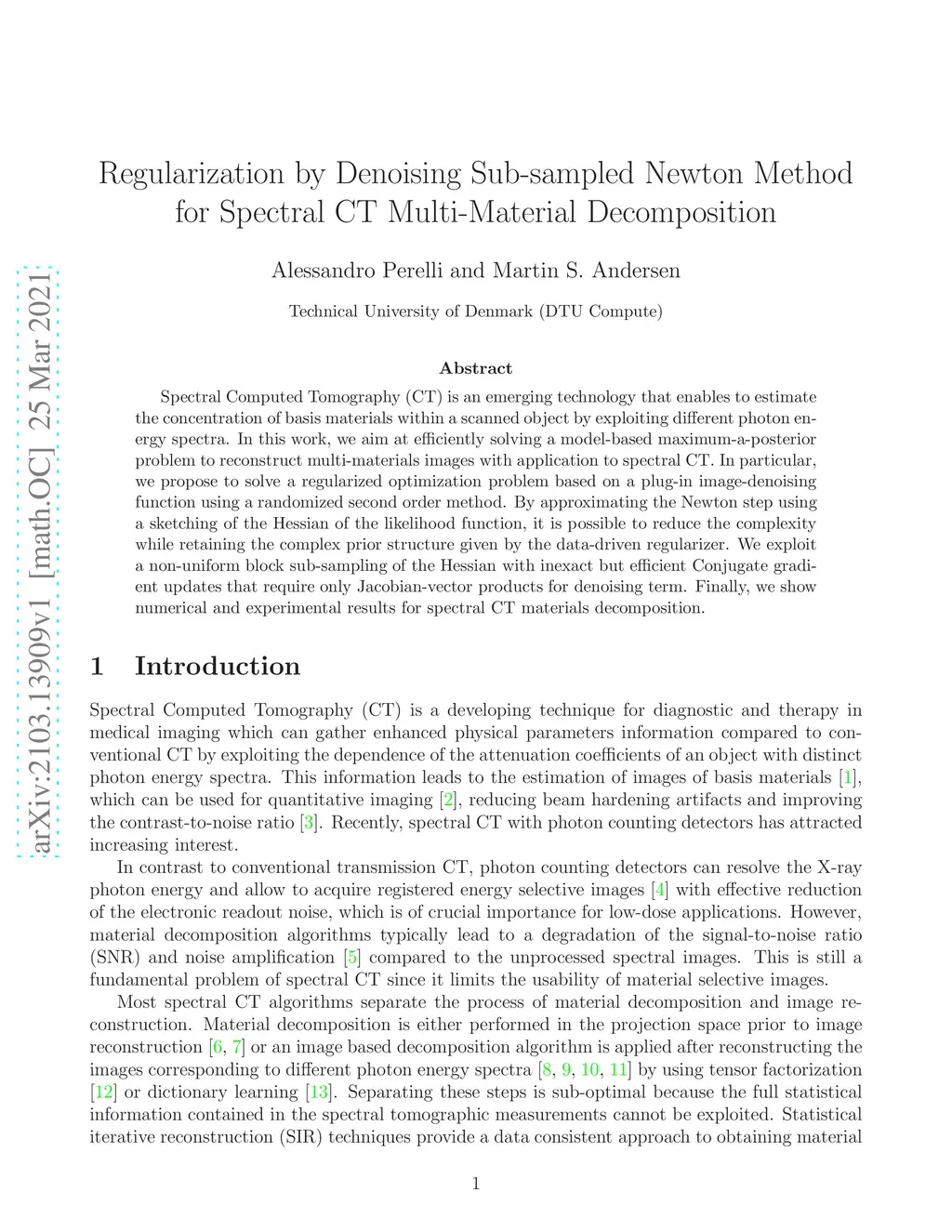 Spectral Computed Tomography (CT) is an emerging technology that enables to estimate the concentration of basis materials within a scanned object by exploiting different photon energy spectra. In this work, we aim at efficiently solving a model-based maximum-a-posterior problem to reconstruct multi-materials images with application to spectral CT. In particular, we propose to solve a regularized optimization problem based on a plug-in image-denoising function using a randomized second order method. By approximating the Newton step using a sketching of the Hessian of the likelihood function, it is possible to reduce the complexity while retaining the complex prior structure given by the data-driven regularizer. We exploit a non-uniform block sub-sampling of the Hessian with inexact but efficient Conjugate gradient updates that require only Jacobian-vector products for denoising term. Finally, we show numerical and experimental results for spectral CT materials decomposition.