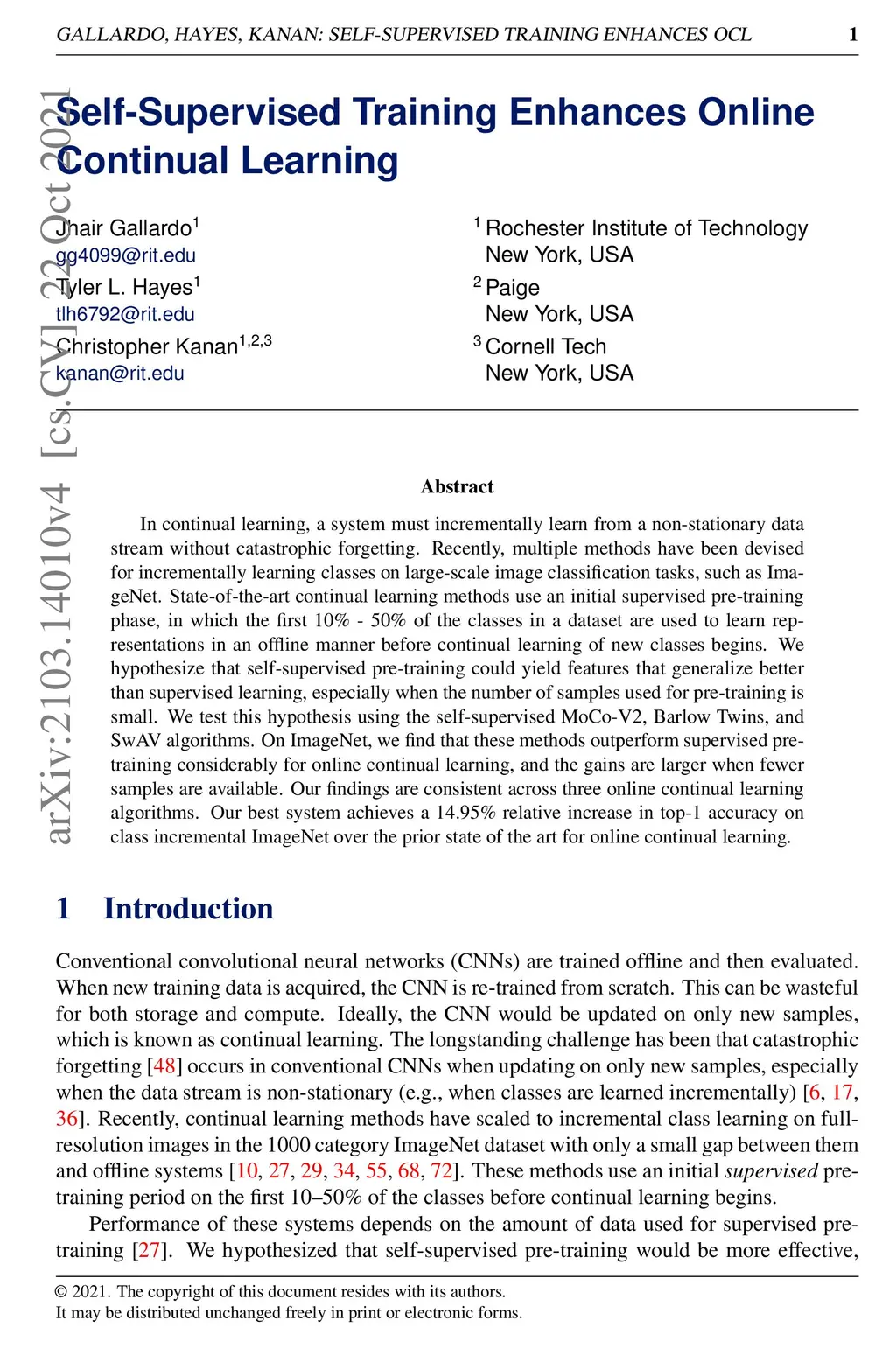 Self-Supervised Training Enhances Online Continual Learning