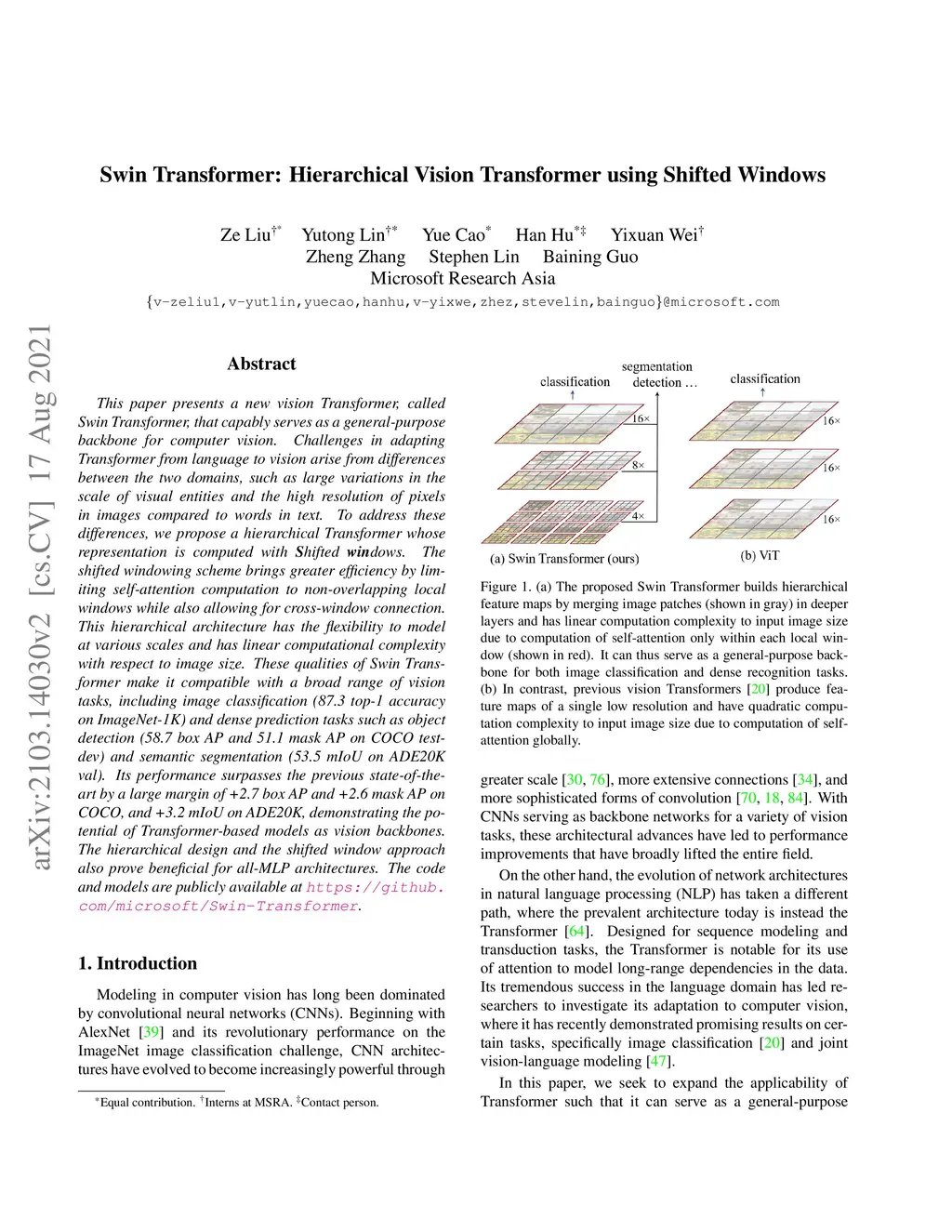This paper presents a new vision Transformer, called Swin Transformer, that capably serves as a general-purpose backbone for computer vision. Challenges in adapting Transformer from language to vision arise from differences between the two domains, such as large variations in the scale of visual entities and the high resolution of pixels in images compared to words in text. To address these differences, we propose a hierarchical Transformer whose representation is computed with \textbf{S}hifted \textbf{win}dows. The shifted windowing scheme brings greater efficiency by limiting self-attention computation to non-overlapping local windows while also allowing for cross-window connection. This hierarchical architecture has the flexibility to model at various scales and has linear computational complexity with respect to image size. These qualities of Swin Transformer make it compatible with a broad range of vision tasks, including image classification (87.3 top-1 accuracy on ImageNet-1K) and dense prediction tasks such as object detection (58.7 box AP and 51.1 mask AP on COCO test-dev) and semantic segmentation (53.5 mIoU on ADE20K val). Its performance surpasses the previous state-of-the-art by a large margin of +2.7 box AP and +2.6 mask AP on COCO, and +3.2 mIoU on ADE20K, demonstrating the potential of Transformer-based models as vision backbones. The hierarchical design and the shifted window approach also prove beneficial for all-MLP architectures. The code and models are publicly available at~\url{https://github.com/microsoft/Swin-Transformer}.
