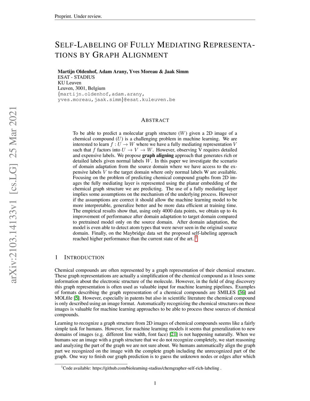 To be able to predict a molecular graph structure () given a 2D image of a chemical compound () is a challenging problem in machine learning. We are interested to learn where we have a fully mediating representation such that factors into . However, observing V requires detailed and expensive labels. We propose graph aligning approach that generates rich or detailed labels given normal labels . In this paper we investigate the scenario of domain adaptation from the source domain where we have access to the expensive labels to the target domain where only normal labels W are available. Focusing on the problem of predicting chemical compound graphs from 2D images the fully mediating layer is represented using the planar embedding of the chemical graph structure we are predicting. The use of a fully mediating layer implies some assumptions on the mechanism of the underlying process. However if the assumptions are correct it should allow the machine learning model to be more interpretable, generalize better and be more data efficient at training time. The empirical results show that, using only 4000 data points, we obtain up to 4x improvement of performance after domain adaptation to target domain compared to pretrained model only on the source domain. After domain adaptation, the model is even able to detect atom types that were never seen in the original source domain. Finally, on the Maybridge data set the proposed self-labeling approach reached higher performance than the current state of the art.