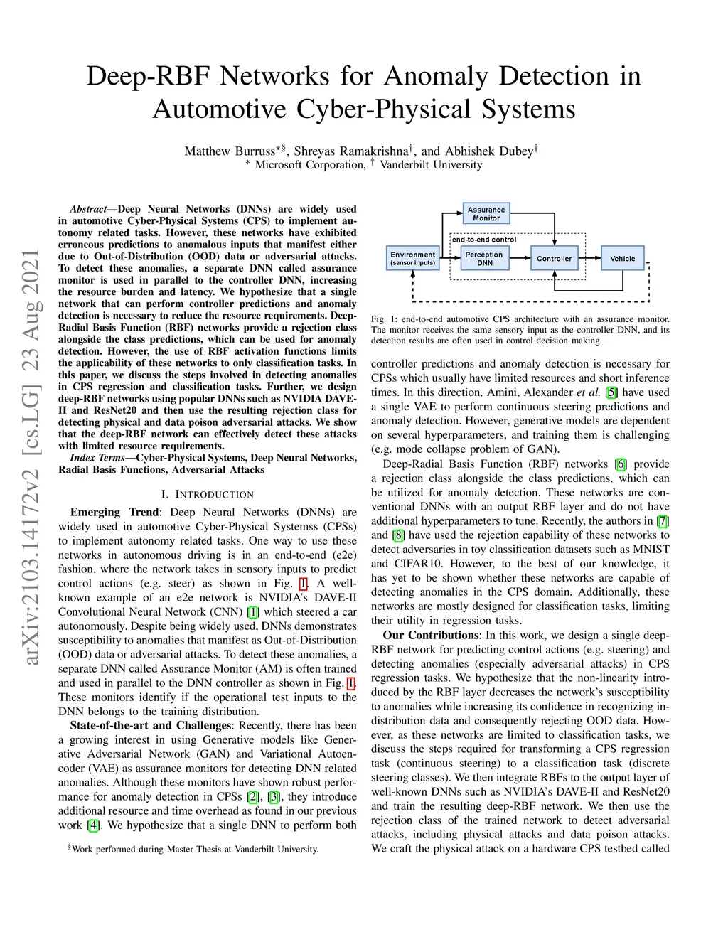 Deep Neural Networks (DNNs) are popularly used for implementing autonomy related tasks in automotive Cyber-Physical Systems (CPSs). However, these networks have been shown to make erroneous predictions to anomalous inputs, which manifests either due to Out-of-Distribution (OOD) data or adversarial attacks. To detect these anomalies, a separate DNN called assurance monitor is often trained and used in parallel to the controller DNN, increasing the resource burden and latency. We hypothesize that a single network that can perform controller predictions and anomaly detection is necessary to reduce the resource requirements. Deep-Radial Basis Function (RBF) networks provide a rejection class alongside the class predictions, which can be utilized for detecting anomalies at runtime. However, the use of RBF activation functions limits the applicability of these networks to only classification tasks. In this paper, we show how the deep-RBF network can be used for detecting anomalies in CPS regression tasks such as continuous steering predictions. Further, we design deep-RBF networks using popular DNNs such as NVIDIA DAVE-II, and ResNet20, and then use the resulting rejection class for detecting adversarial attacks such as a physical attack and data poison attack. Finally, we evaluate these attacks and the trained deep-RBF networks using a hardware CPS testbed called DeepNNCar and a real-world German Traffic Sign Benchmark (GTSB) dataset. Our results show that the deep-RBF networks can robustly detect these attacks in a short time without additional resource requirements.