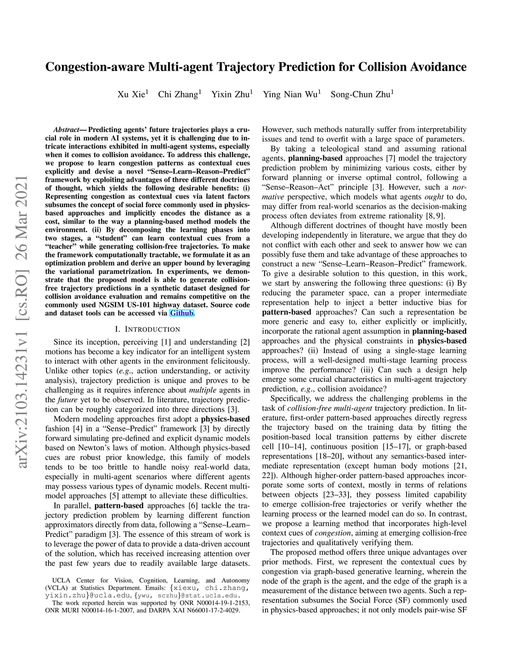 Predicting agents' future trajectories plays a crucial role in modern AI systems, yet it is challenging due to intricate interactions exhibited in multi-agent systems, especially when it comes to collision avoidance. To address this challenge, we propose to learn congestion patterns as contextual cues explicitly and devise a novel "Sense--Learn--Reason--Predict" framework by exploiting advantages of three different doctrines of thought, which yields the following desirable benefits: (i) Representing congestion as contextual cues via latent factors subsumes the concept of social force commonly used in physics-based approaches and implicitly encodes the distance as a cost, similar to the way a planning-based method models the environment. (ii) By decomposing the learning phases into two stages, a "student" can learn contextual cues from a "teacher" while generating collision-free trajectories. To make the framework computationally tractable, we formulate it as an optimization problem and derive an upper bound by leveraging the variational parametrization. In experiments, we demonstrate that the proposed model is able to generate collision-free trajectory predictions in a synthetic dataset designed for collision avoidance evaluation and remains competitive on the commonly used NGSIM US-101 highway dataset.