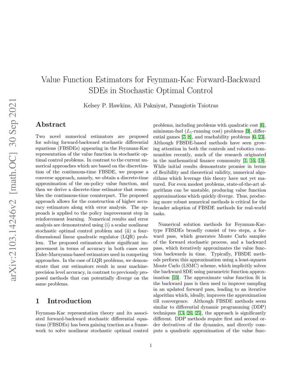 Two novel numerical estimators are proposed for solving forward-backward stochastic differential equations (FBSDEs) appearing in the Feynman-Kac representation of the value function in stochastic optimal control problems. In contrast to the current numerical approaches which are based on the discretization of the continuous-time FBSDE, we propose a converse approach, namely, we obtain a discrete-time approximation of the on-policy value function, and then we derive a discrete-time estimator that resembles the continuous-time counterpart. The proposed approach allows for the construction of higher accuracy estimators along with error analysis. The approach is applied to the policy improvement step in reinforcement learning. Numerical results and error analysis are demonstrated using (i) a scalar nonlinear stochastic optimal control problem and (ii) a four-dimensional linear quadratic regulator (LQR) problem. The proposed estimators show significant improvement in terms of accuracy in both cases over Euler-Maruyama-based estimators used in competing approaches. In the case of LQR problems, we demonstrate that our estimators result in near machine-precision level accuracy, in contrast to previously proposed methods that can potentially diverge on the same problems.