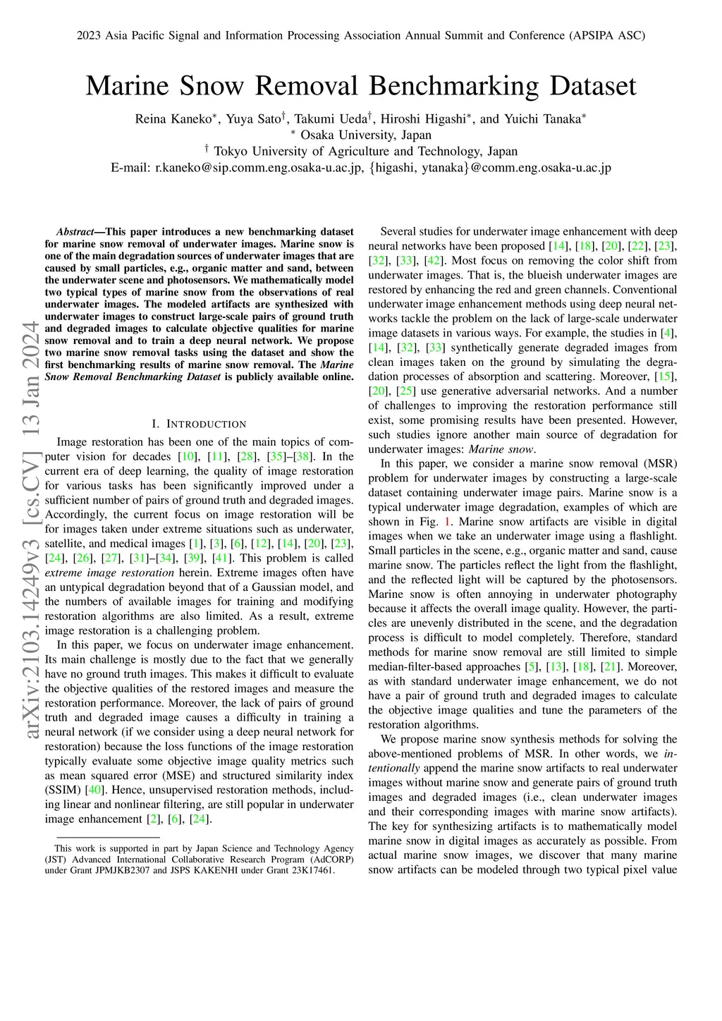 This paper introduces a new benchmarking dataset for marine snow removal of underwater images. Marine snow is one of the main degradation sources of underwater images that are caused by small particles, e.g., organic matter and sand, between the underwater scene and photosensors. We mathematically model two typical types of marine snow from the observations of real underwater images. The modeled artifacts are synthesized with underwater images to construct large-scale pairs of ground truth and degraded images to calculate objective qualities for marine snow removal and to train a deep neural network. We propose two marine snow removal tasks using the dataset and show the first benchmarking results of marine snow removal. The Marine Snow Removal Benchmarking Dataset is publicly available online.