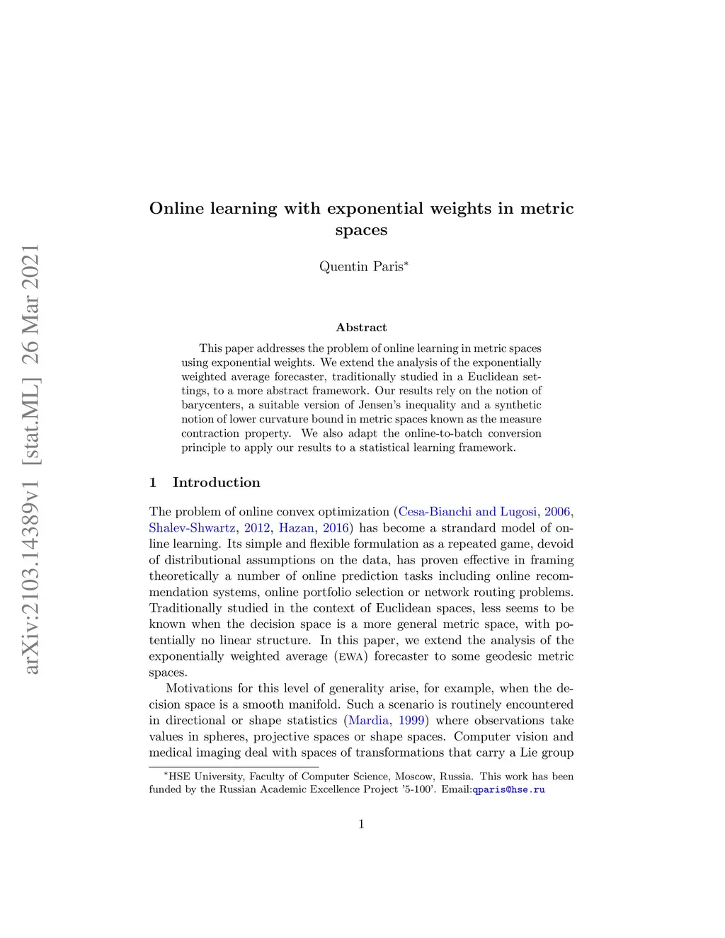 This paper addresses the problem of online learning in metric spaces using exponential weights. We extend the analysis of the exponentially weighted average forecaster, traditionally studied in a Euclidean settings, to a more abstract framework. Our results rely on the notion of barycenters, a suitable version of Jensen's inequality and a synthetic notion of lower curvature bound in metric spaces known as the measure contraction property. We also adapt the online-to-batch conversion principle to apply our results to a statistical learning framework.