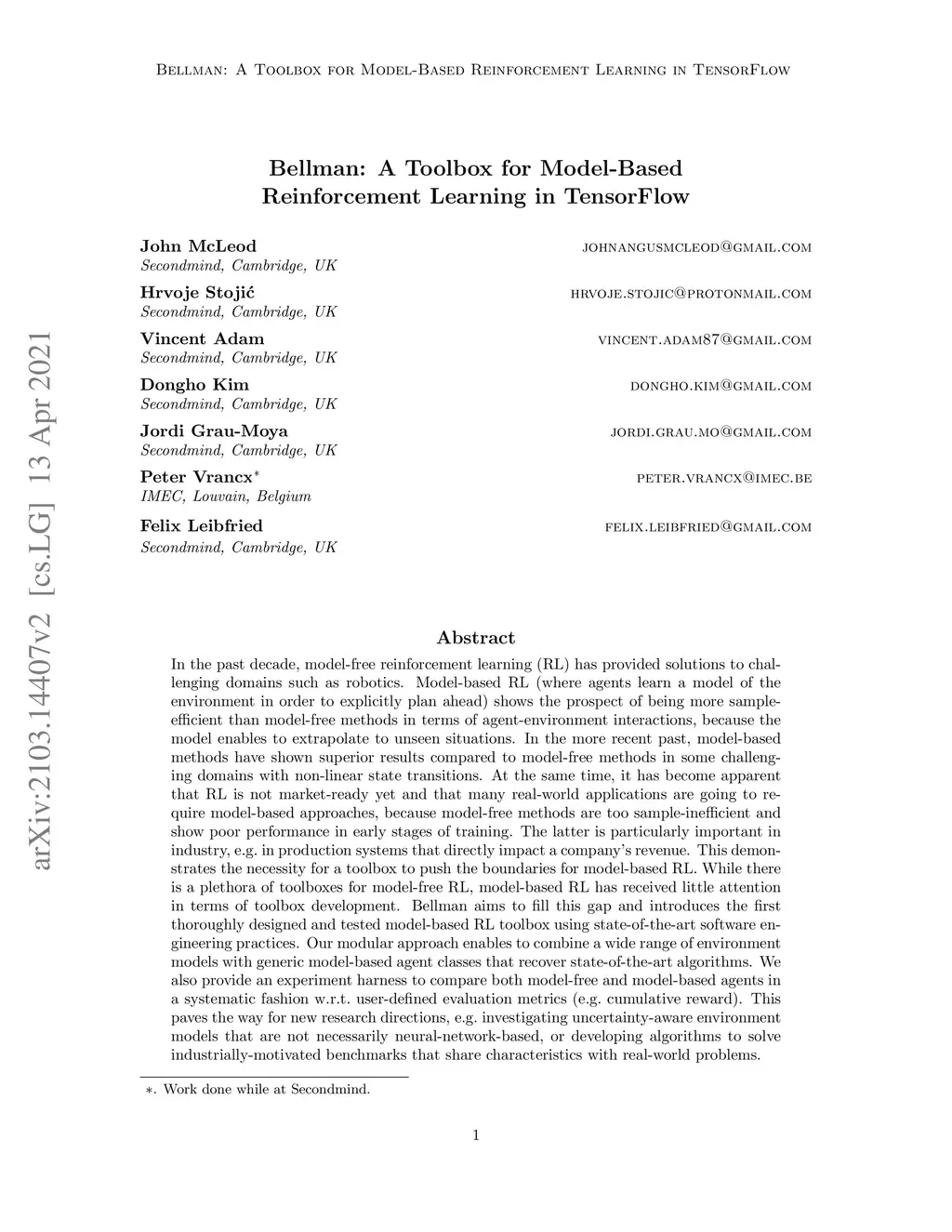 Bellman: A Toolbox for Model-Based Reinforcement Learning in TensorFlow