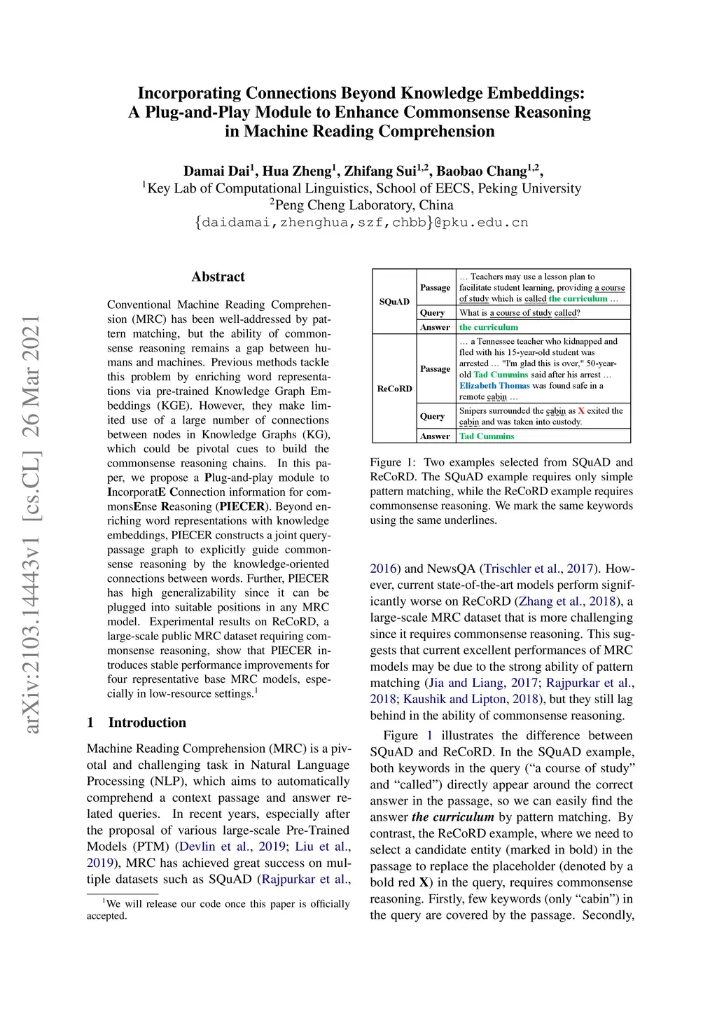 Conventional Machine Reading Comprehension (MRC) has been well-addressed by pattern matching, but the ability of commonsense reasoning remains a gap between humans and machines. Previous methods tackle this problem by enriching word representations via pre-trained Knowledge Graph Embeddings (KGE). However, they make limited use of a large number of connections between nodes in Knowledge Graphs (KG), which could be pivotal cues to build the commonsense reasoning chains. In this paper, we propose a Plug-and-play module to IncorporatE Connection information for commonsEnse Reasoning (PIECER). Beyond enriching word representations with knowledge embeddings, PIECER constructs a joint query-passage graph to explicitly guide commonsense reasoning by the knowledge-oriented connections between words. Further, PIECER has high generalizability since it can be plugged into suitable positions in any MRC model. Experimental results on ReCoRD, a large-scale public MRC dataset requiring commonsense reasoning, show that PIECER introduces stable performance improvements for four representative base MRC models, especially in low-resource settings.