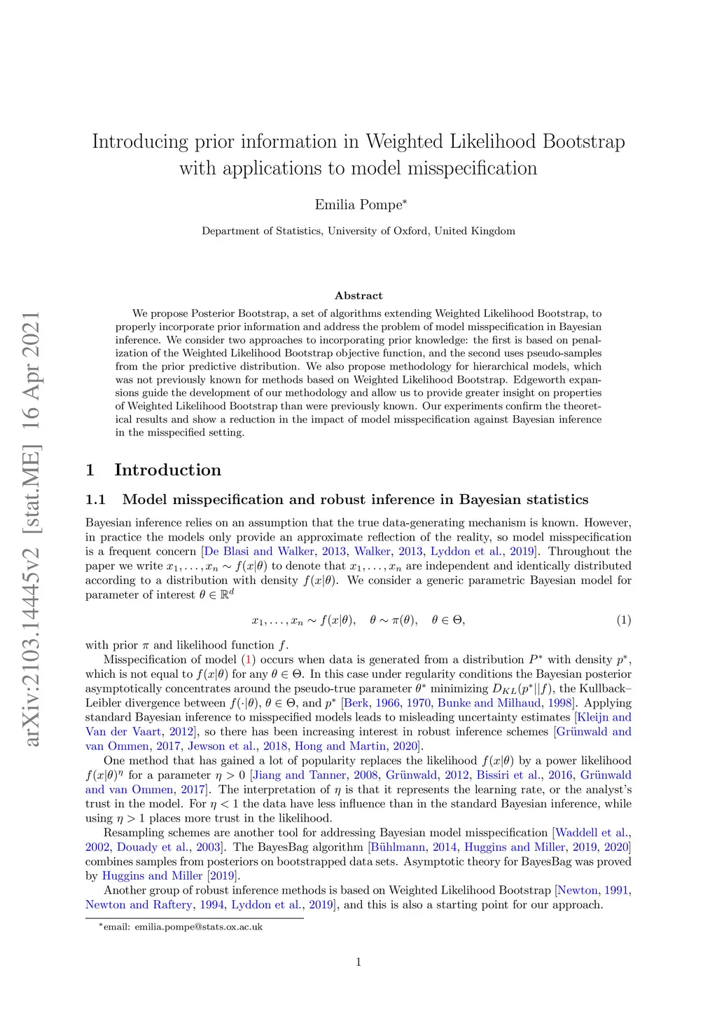 We propose Posterior Bootstrap, a set of algorithms extending Weighted Likelihood Bootstrap, to properly incorporate prior information and address the problem of model misspecification in Bayesian inference. We consider two approaches to incorporating prior knowledge: the first is based on penalization of the Weighted Likelihood Bootstrap objective function, and the second uses pseudo-samples from the prior predictive distribution. We also propose methodology for hierarchical models, which was not previously known for methods based on Weighted Likelihood Bootstrap. Edgeworth expansions guide the development of our methodology and allow us to provide greater insight on properties of Weighted Likelihood Bootstrap than were previously known. Our experiments confirm the theoretical results and show a reduction in the impact of model misspecification against Bayesian inference in the misspecified setting.
