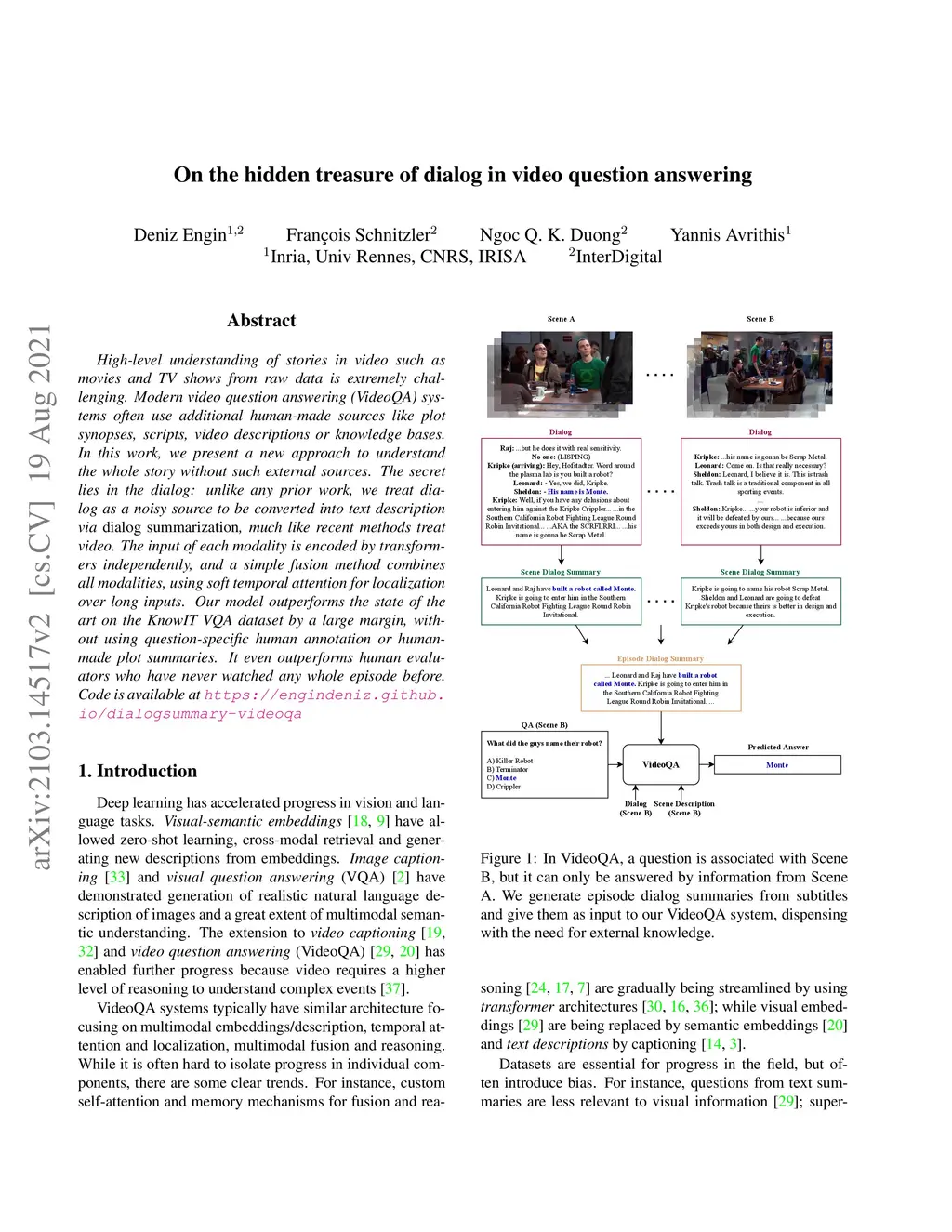 High-level understanding of stories in video such as movies and TV shows from raw data is extremely challenging. Modern video question answering (VideoQA) systems often use additional human-made sources like plot synopses, scripts, video descriptions or knowledge bases. In this work, we present a new approach to understand the whole story without such external sources. The secret lies in the dialog: unlike any prior work, we treat dialog as a noisy source to be converted into text description via dialog summarization, much like recent methods treat video. The input of each modality is encoded by transformers independently, and a simple fusion method combines all modalities, using soft temporal attention for localization over long inputs. Our model outperforms the state of the art on the KnowIT VQA dataset by a large margin, without using question-specific human annotation or human-made plot summaries. It even outperforms human evaluators who have never watched any whole episode before. Code is available at https://engindeniz.github.io/dialogsummary-videoqa