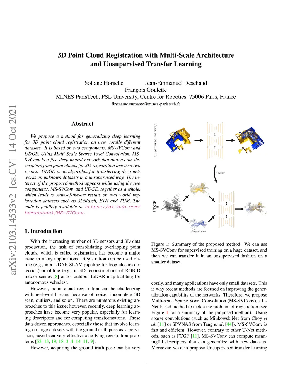 We propose a method for generalizing deep learning for 3D point cloud registration on new, totally different datasets. It is based on two components, MS-SVConv and UDGE. Using Multi-Scale Sparse Voxel Convolution, MS-SVConv is a fast deep neural network that outputs the descriptors from point clouds for 3D registration between two scenes. UDGE is an algorithm for transferring deep networks on unknown datasets in a unsupervised way. The interest of the proposed method appears while using the two components, MS-SVConv and UDGE, together as a whole, which leads to state-of-the-art results on real world registration datasets such as 3DMatch, ETH and TUM. The code is publicly available at https://github.com/humanpose1/MS-SVConv .