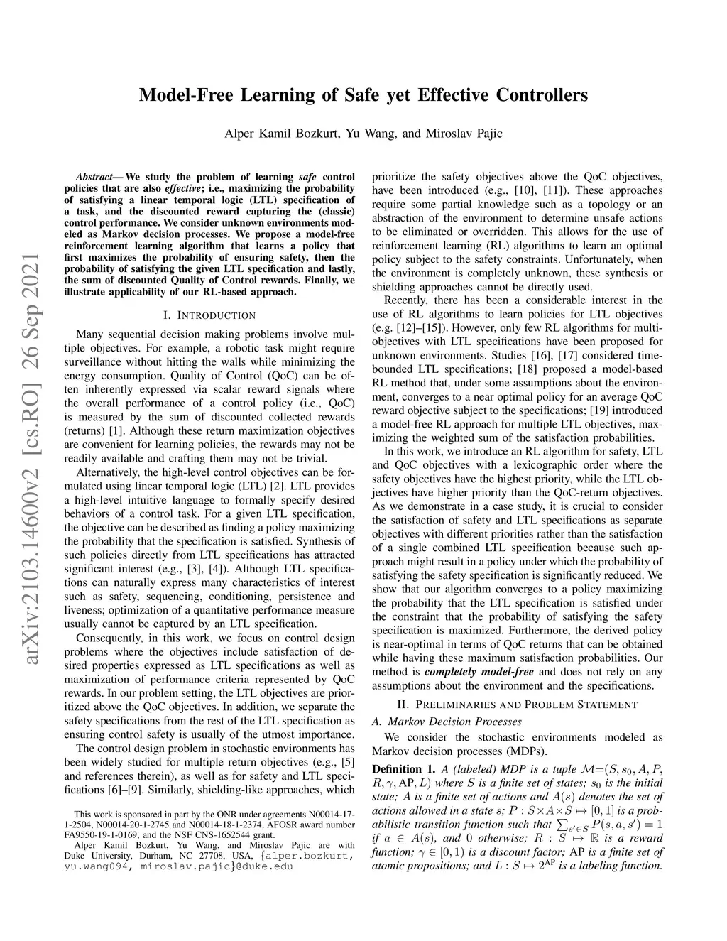We study the problem of learning safe control policies that are also effective; i.e., maximizing the probability of satisfying a linear temporal logic (LTL) specification of a task, and the discounted reward capturing the (classic) control performance. We consider unknown environments modeled as Markov decision processes. We propose a model-free reinforcement learning algorithm that learns a policy that first maximizes the probability of ensuring safety, then the probability of satisfying the given LTL specification and lastly, the sum of discounted Quality of Control rewards. Finally, we illustrate applicability of our RL-based approach.