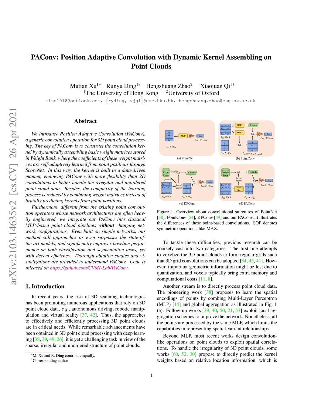 We introduce Position Adaptive Convolution (PAConv), a generic convolution operation for 3D point cloud processing. The key of PAConv is to construct the convolution kernel by dynamically assembling basic weight matrices stored in Weight Bank, where the coefficients of these weight matrices are self-adaptively learned from point positions through ScoreNet. In this way, the kernel is built in a data-driven manner, endowing PAConv with more flexibility than 2D convolutions to better handle the irregular and unordered point cloud data. Besides, the complexity of the learning process is reduced by combining weight matrices instead of brutally predicting kernels from point positions. Furthermore, different from the existing point convolution operators whose network architectures are often heavily engineered, we integrate our PAConv into classical MLP-based point cloud pipelines without changing network configurations. Even built on simple networks, our method still approaches or even surpasses the state-of-the-art models, and significantly improves baseline performance on both classification and segmentation tasks, yet with decent efficiency. Thorough ablation studies and visualizations are provided to understand PAConv. Code is released on https://github.com/CVMI-Lab/PAConv.