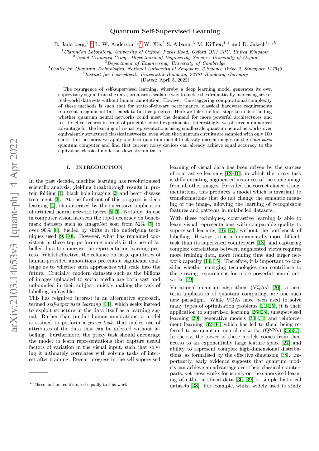 The resurgence of self-supervised learning, whereby a deep learning model generates its own supervisory signal from the data, promises a scalable way to tackle the dramatically increasing size of real-world data sets without human annotation. However, the staggering computational complexity of these methods is such that for state-of-the-art performance, classical hardware requirements represent a significant bottleneck to further progress. Here we take the first steps to understanding whether quantum neural networks could meet the demand for more powerful architectures and test its effectiveness in proof-of-principle hybrid experiments. Interestingly, we observe a numerical advantage for the learning of visual representations using small-scale quantum neural networks over equivalently structured classical networks, even when the quantum circuits are sampled with only 100 shots. Furthermore, we apply our best quantum model to classify unseen images on the ibmq\_paris quantum computer and find that current noisy devices can already achieve equal accuracy to the equivalent classical model on downstream tasks.