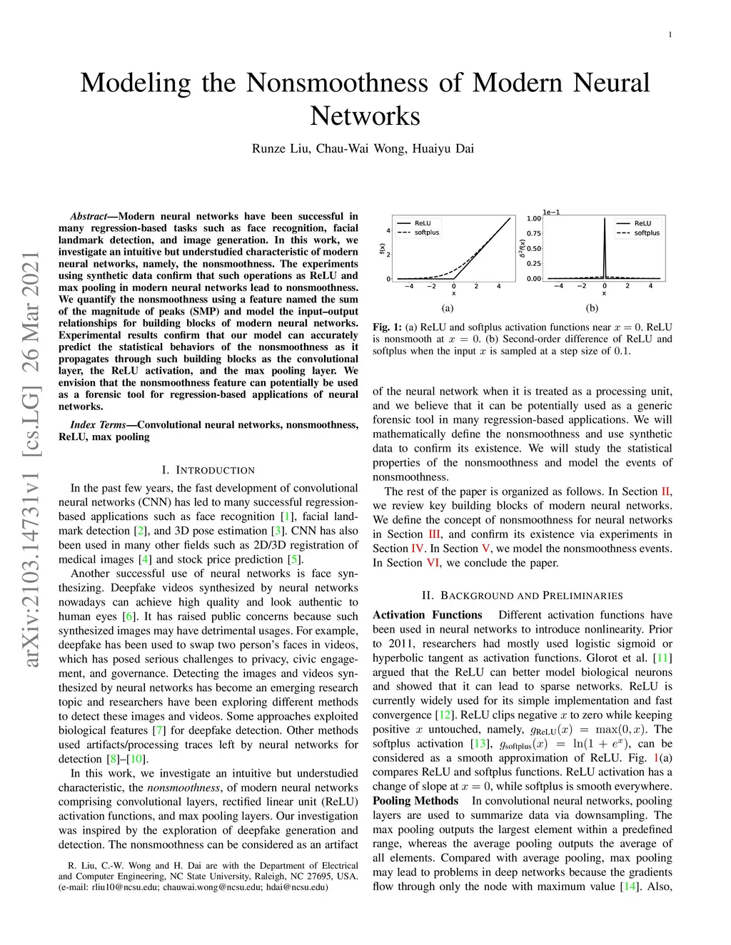 Modern neural networks have been successful in many regression-based tasks such as face recognition, facial landmark detection, and image generation. In this work, we investigate an intuitive but understudied characteristic of modern neural networks, namely, the nonsmoothness. The experiments using synthetic data confirm that such operations as ReLU and max pooling in modern neural networks lead to nonsmoothness. We quantify the nonsmoothness using a feature named the sum of the magnitude of peaks (SMP) and model the input-output relationships for building blocks of modern neural networks. Experimental results confirm that our model can accurately predict the statistical behaviors of the nonsmoothness as it propagates through such building blocks as the convolutional layer, the ReLU activation, and the max pooling layer. We envision that the nonsmoothness feature can potentially be used as a forensic tool for regression-based applications of neural networks.