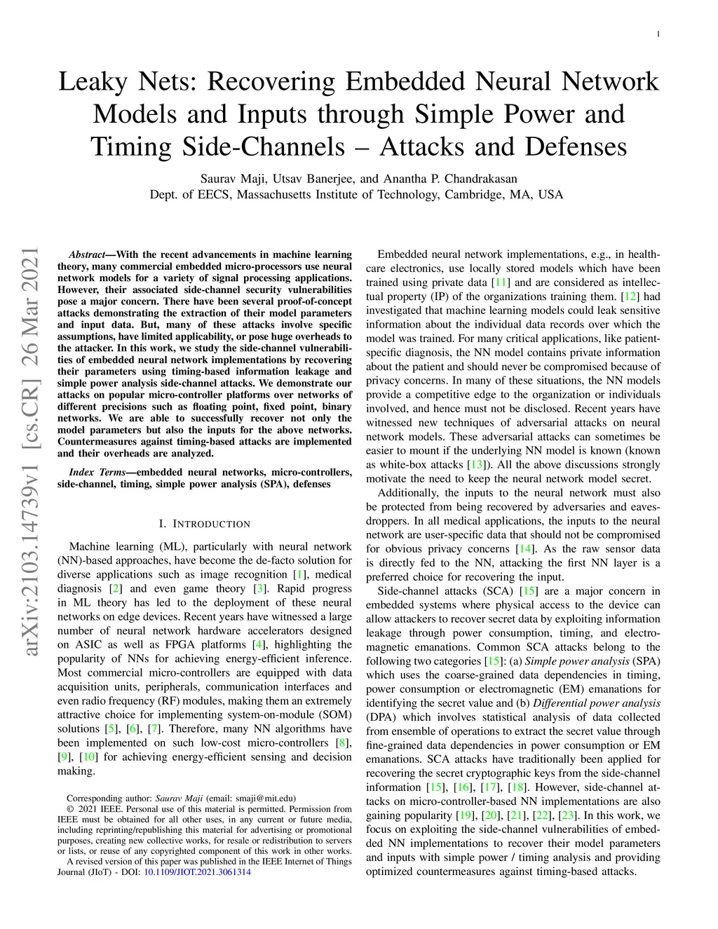 With the recent advancements in machine learning theory, many commercial embedded micro-processors use neural network models for a variety of signal processing applications. However, their associated side-channel security vulnerabilities pose a major concern. There have been several proof-of-concept attacks demonstrating the extraction of their model parameters and input data. But, many of these attacks involve specific assumptions, have limited applicability, or pose huge overheads to the attacker. In this work, we study the side-channel vulnerabilities of embedded neural network implementations by recovering their parameters using timing-based information leakage and simple power analysis side-channel attacks. We demonstrate our attacks on popular micro-controller platforms over networks of different precisions such as floating point, fixed point, binary networks. We are able to successfully recover not only the model parameters but also the inputs for the above networks. Countermeasures against timing-based attacks are implemented and their overheads are analyzed.