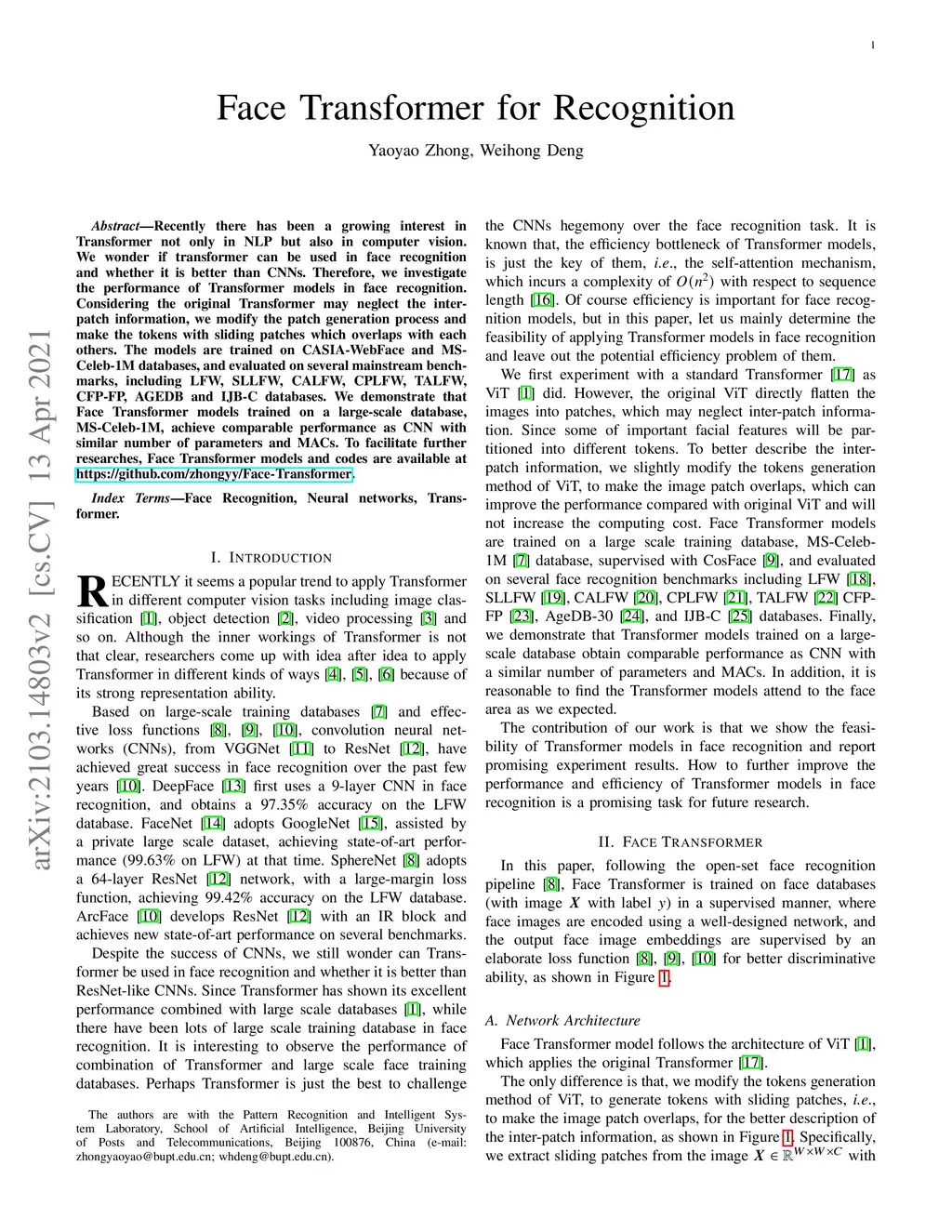 Recently there has been a growing interest in Transformer not only in NLP but also in computer vision. We wonder if transformer can be used in face recognition and whether it is better than CNNs. Therefore, we investigate the performance of Transformer models in face recognition. Considering the original Transformer may neglect the inter-patch information, we modify the patch generation process and make the tokens with sliding patches which overlaps with each others. The models are trained on CASIA-WebFace and MS-Celeb-1M databases, and evaluated on several mainstream benchmarks, including LFW, SLLFW, CALFW, CPLFW, TALFW, CFP-FP, AGEDB and IJB-C databases. We demonstrate that Face Transformer models trained on a large-scale database, MS-Celeb-1M, achieve comparable performance as CNN with similar number of parameters and MACs. To facilitate further researches, Face Transformer models and codes are available at https://github.com/zhongyy/Face-Transformer.